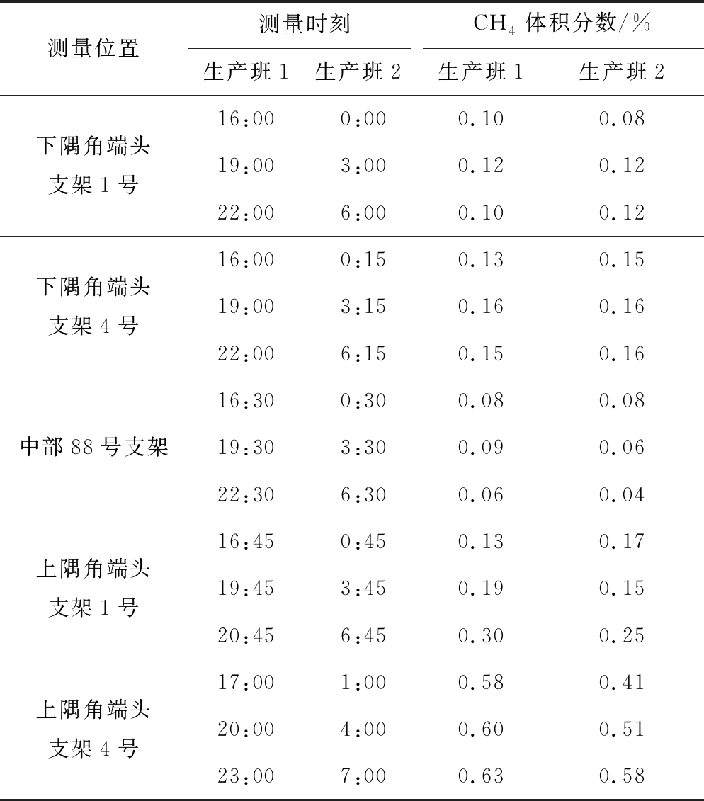 由表1知,上隅角、下隅角位置甲烷体积分数明显高于其他区域,且上隅角位置甲烷体积分数测线A>测线C>测线B,下隅角位置甲烷体积分数没有明显的分布特征。为确定生产过程中的甲烷分布情况,随后2个生产班对现场体积分数进行了补充测量,补充测量地点选择下隅角端头支架1号、下隅角端头支架4号、中部88号支架,上隅角端头支架1号和上隅角端头支架4号位置,每个生产班测量3次甲烷体积分数,数据见表2。
