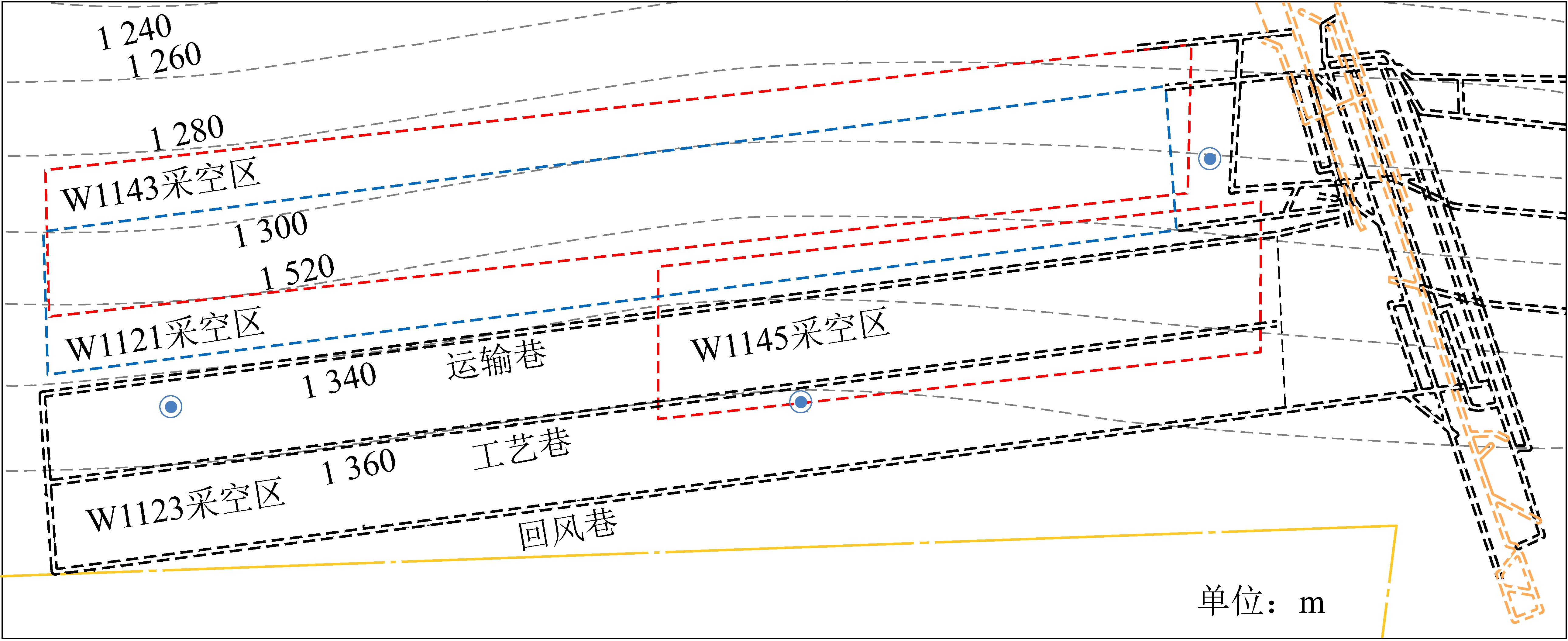 以上作者采用理论分析、数值模拟及现场数据分析等方法对上覆保护层开采后下部被保护层冲击地压的发生机理及防治措施。上覆残采煤层不均衡空间结构即为上保护层不充分开采遗留的开切眼、煤柱及空间叠加等多种结构,既有应力集中区又有应力减下区,相较单一的煤柱下应力集中情况更为复杂,鲜有讨论上覆残采煤层不均衡空间结构下诱发下部被保护煤层冲击地压。基于此,针对神华新疆能源有限责任公司某矿W1123工作面上覆残采煤层W1145不均衡空间结构对下煤层影响,研究上覆采空条件下不均衡空间结构冲击地压发生机理及规律,对于类似地质及开采条件下矿井的安全回采具有重要意义。
