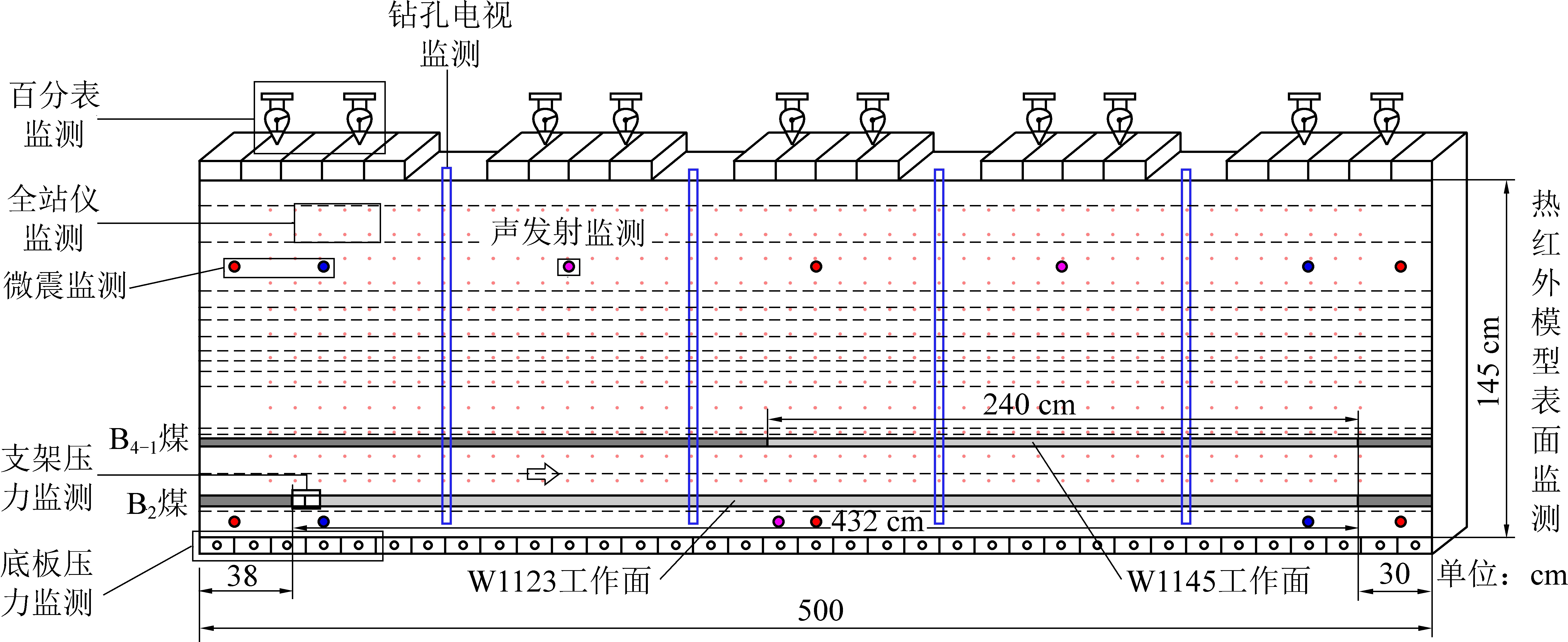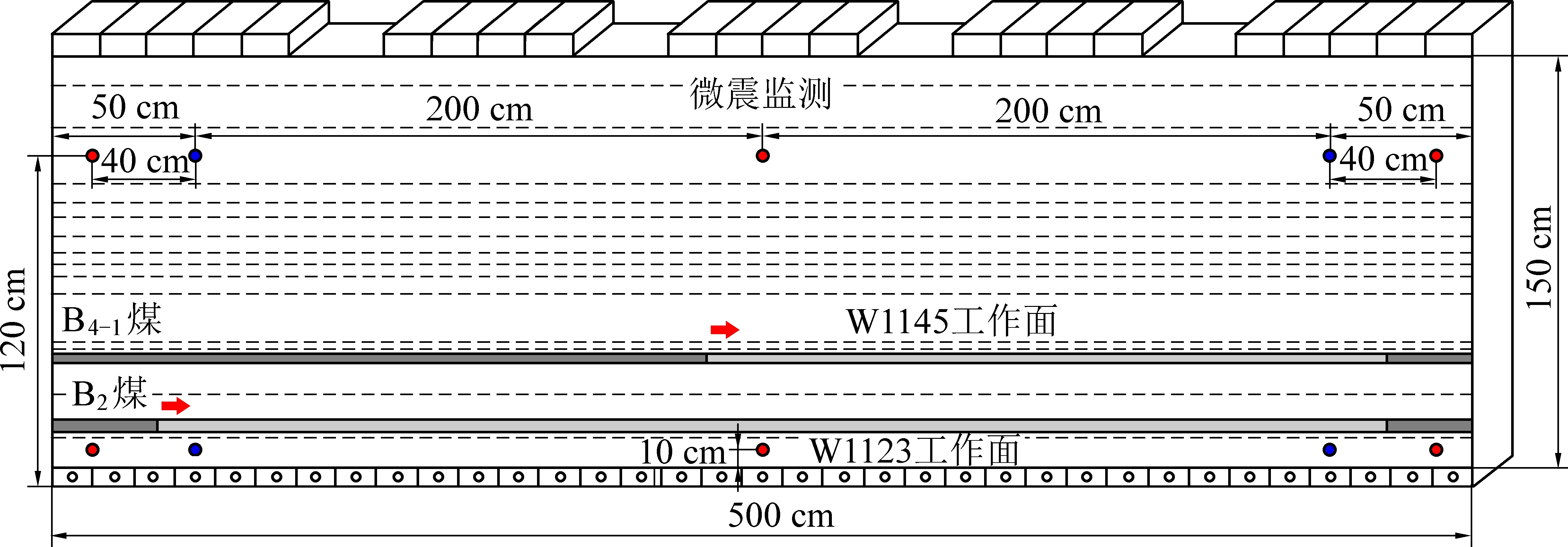 为解决 W1123工作面面临的覆岩破断及多结构失稳致灾问题,统筹优化工作面开采设计参数与冲击地压防控措施,搭建缓倾斜特厚煤层及冲击倾向性顶板条件下走向物理相似模型,揭示W1123工作面覆岩破断垮落的结构及层位关系。