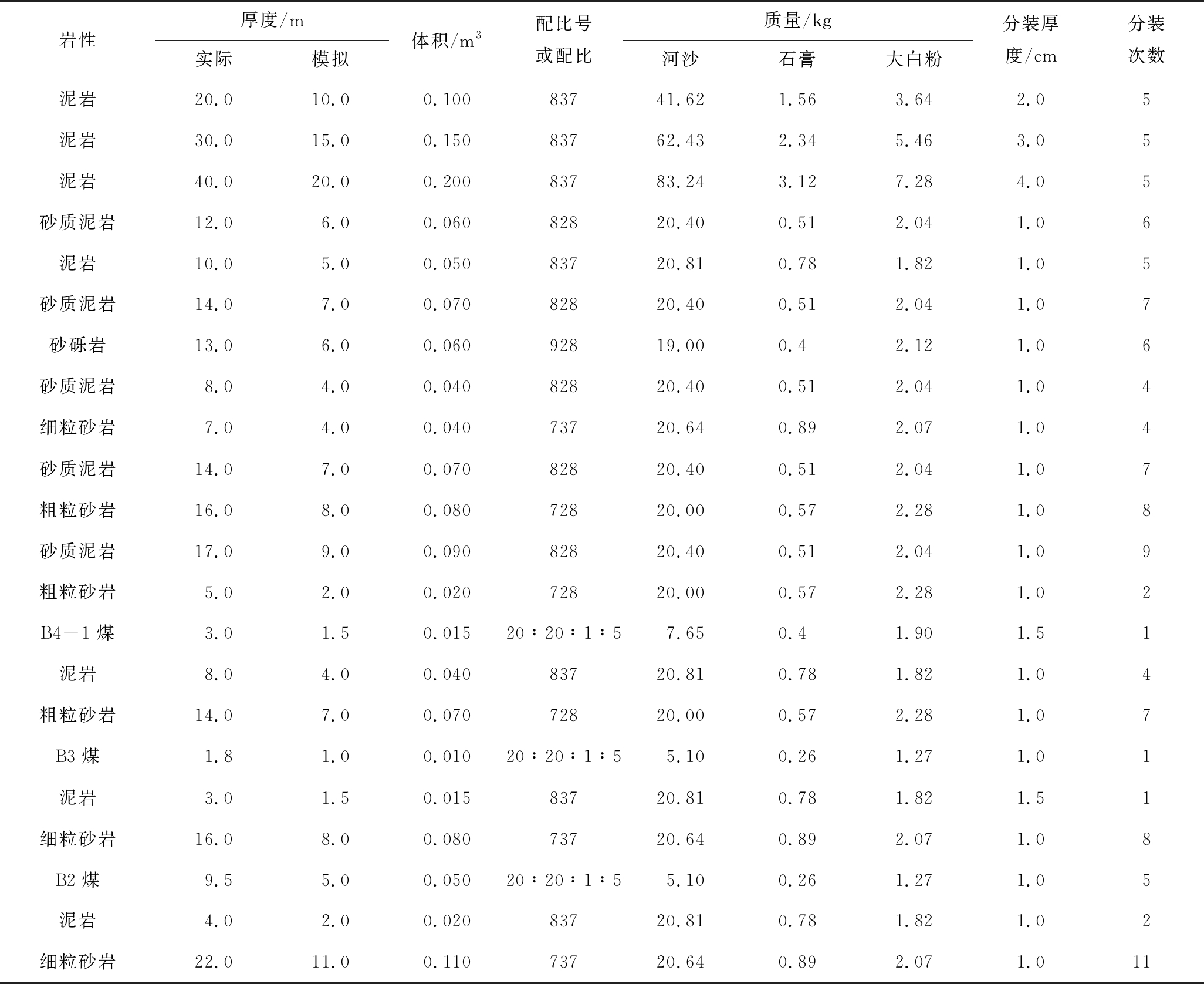 岩性厚度/m实际模拟体积/m3配比号或配比质量/kg河沙石膏大白粉分装厚度/cm分装次数泥岩20.010.00.10083741.621.563.642.05泥岩30.015.00.15083762.432.345.463.05泥岩40.020.00.20083783.243.127.284.05砂质泥岩12.06.00.06082820.400.512.041.06泥岩10.05.00.05083720.810.781.821.05砂质泥岩14.07.00.07082820.400.512.041.07砂砾岩13.06.00.06092819.000.42.121.06砂质泥岩8.04.00.04082820.400.512.041.04细粒砂岩7.04.00.04073720.640.892.071.04砂质泥岩14.07.00.07082820.400.512.041.07粗粒砂岩16.08.00.08072820.000.572.281.08砂质泥岩17.09.00.09082820.400.512.041.09粗粒砂岩5.02.00.02072820.000.572.281.02B4-1煤3.01.50.01520∶20∶1∶57.650.41.901.51泥岩8.04.00.04083720.810.781.821.04粗粒砂岩14.07.00.07072820.000.572.281.07B3煤1.81.00.01020∶20∶1∶55.100.261.271.01泥岩3.01.50.01583720.810.781.821.51细粒砂岩16.08.00.08073720.640.892.071.08B2煤9.55.00.05020∶20∶1∶55.100.261.271.05泥岩4.02.00.02083720.810.781.821.02细粒砂岩22.011.00.11073720.640.892.071.011