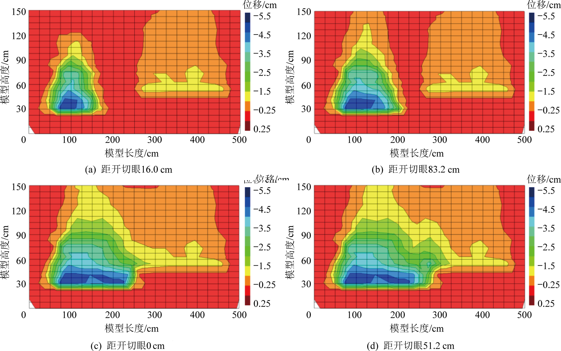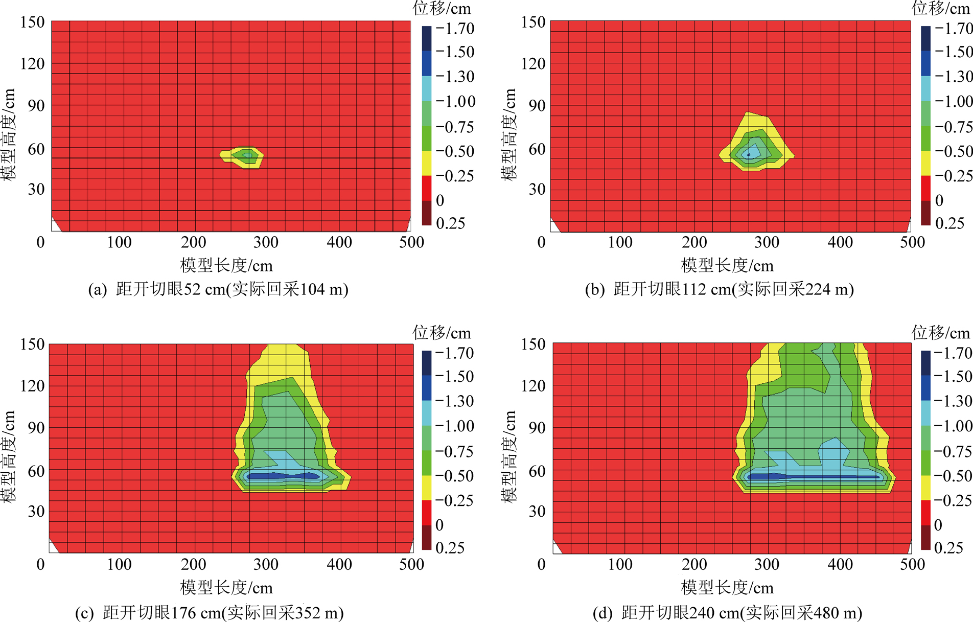 按照工作面回采方案,W1145工作面开切眼位于模型230 cm位置,随着工作面推进,上覆岩层逐渐破坏,并不断向上扩展,当工作面开采至距离开切眼112 cm时,位移在0.25~0.50 cm的区域迅速向上发展;当工作面开采至距离开切眼176 cm时,绿色云图区域显示出位移在0.50~0.75 cm区域,迅速发展并越过工作面上方覆岩高度81 cm,代表着不同岩层移动值的淡绿色、绿色、黄色区域呈倒“U”型分布;当工作面开采至距离开切眼200 cm时,绿色云图区域显示出位移在0.5~0.75 cm的区域达到模型顶部;倒“U”型位移分布愈发明显;当工作面开采至距离开切眼240 cm时,深绿色云图区域显示出位移在0.75~1.00 cm的区域已经达到模型顶部。随着工作面推进,上覆岩体随之下沉,岩层移动逐渐向上发育,岩层影响区域也逐渐变大,随着继续推进,岩层逐渐压实采空区,最终趋于稳定,如图3所示。