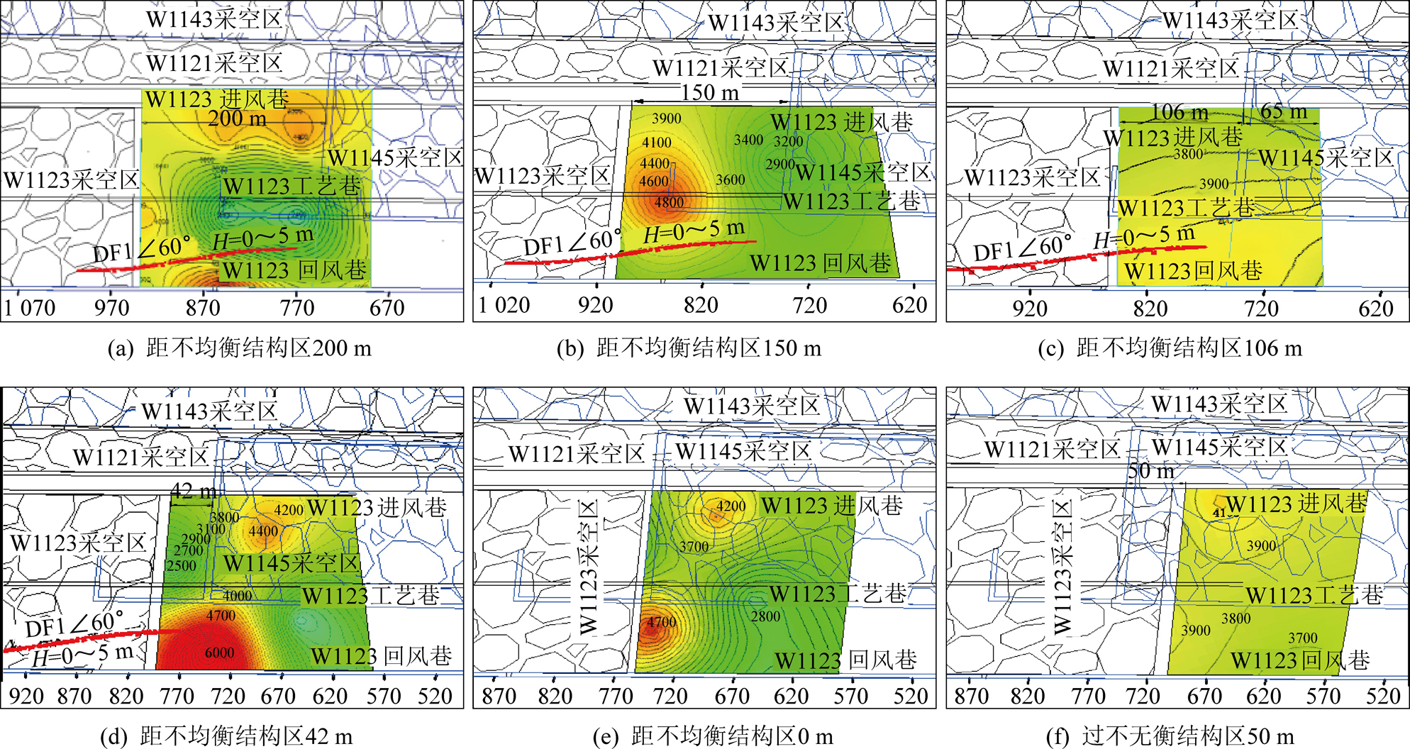 现场实测验证了上覆不均衡结构对其下方煤层开采的影响,工作面推进位置与不均衡结构区,相距200~100 m过程,不均衡结构对工作面围岩应力影响尚未形成叠加作用,工作面围岩应力主要表现为采动应力与侧向应力作用特征;相距100~50 m过程,接近不均衡结构区过程,以局部集中至整体叠加影响为主要特征;相距50~0 m过程,不均衡结构影响分化显著,以W1145开切巷、W1145上平巷边界效应明显分区,实测验证了不均衡结构对冲击危险的作用。