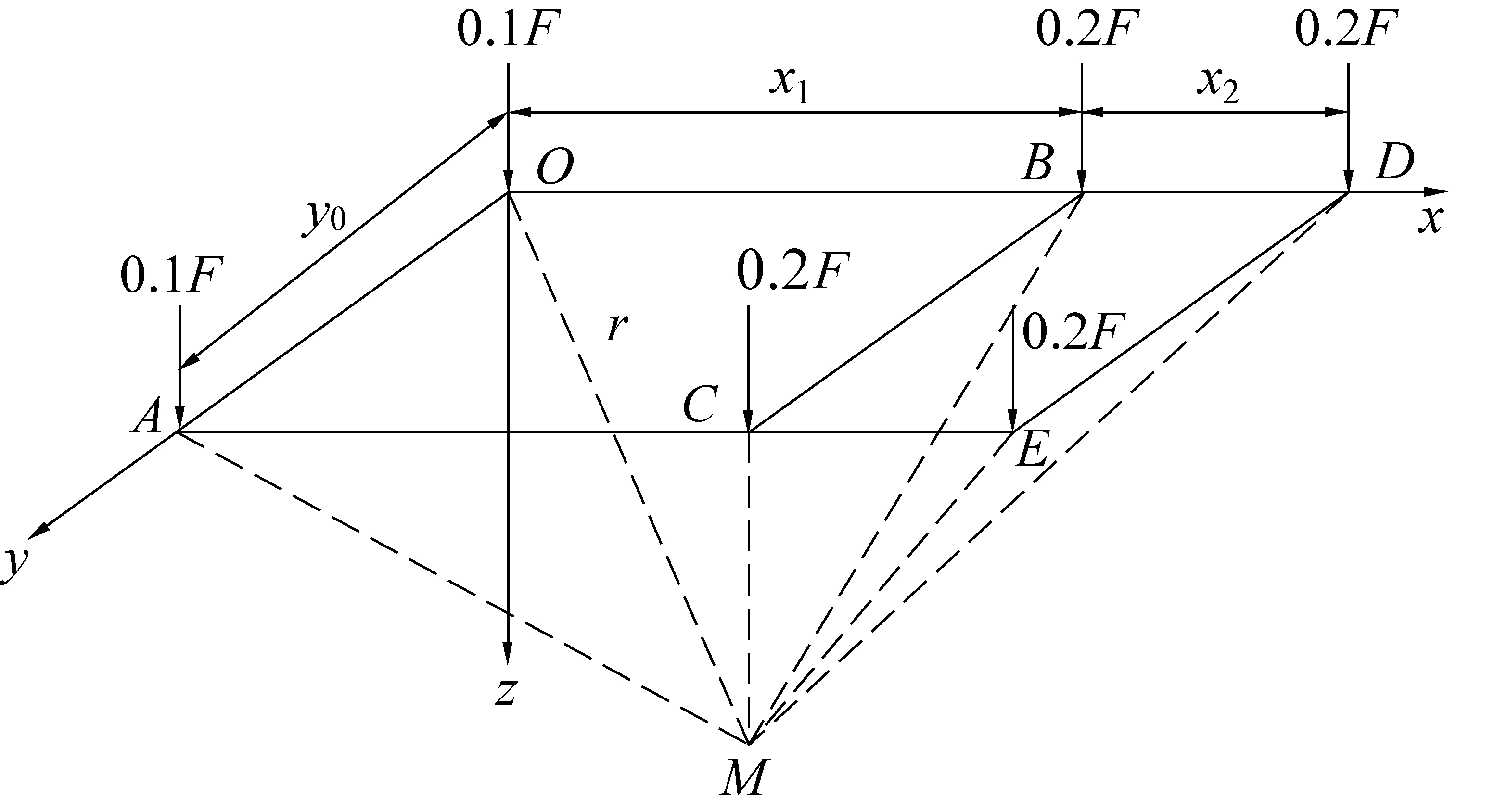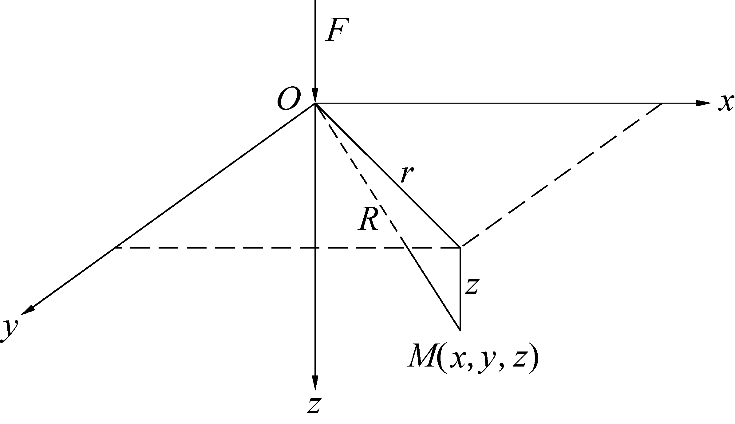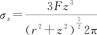 式中,σz为M点的竖向附加应力;F为集中力;r为M点与集中力作用点的水平距离,r2=x2+y2;z为M点的竖向深度,z≥0。