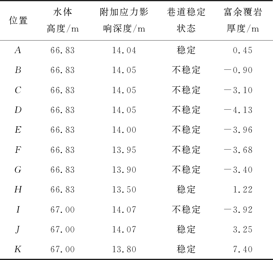 考虑回填后采坑最终积水到+3 772 m标高,按“回填体+车辆+水体载荷”计算的最大附加应力影响深度及巷道稳定状态见表2。