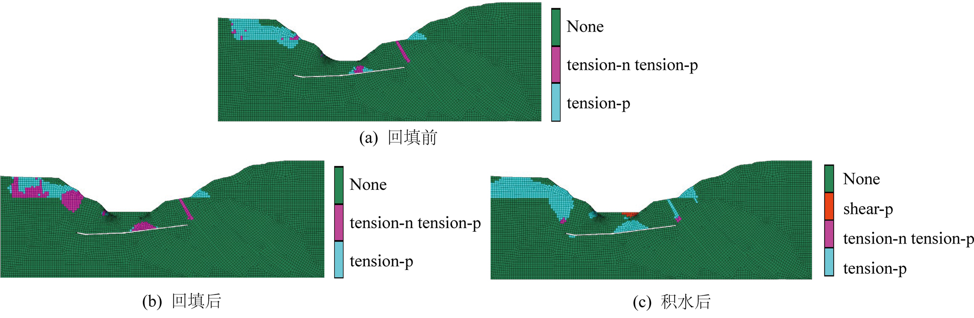 采用数值模拟软件FLAC3D7.0对回填前、后和采坑积水条件下岩体破坏区进行了模拟,模型如图11所示。巷道考虑支护条件,采用pile结构单元进行支护模拟。采坑积水载荷按照水体在回填体和坡体上方的高度产生的水压施加地表边界条件,如图11c所示。图12为模拟得到的回填前、回填后和采坑积水条件下岩体破坏区分布情况。如图12所示,回填前,巷道覆岩在起坡后55 m范围出现塑性区,塑性区高度没有波及到地表;回填后的巷道覆岩塑性区范围和高度增加,但仍然没有到达地表;回填地表积水后,巷道覆岩塑性区水平范围进一步增加到约60 m,回填体的破坏深度与覆岩破坏高度几乎沟通,巷道具有失稳风险,与理论计算的结论相符。需要采取措施保证井工巷道安全。