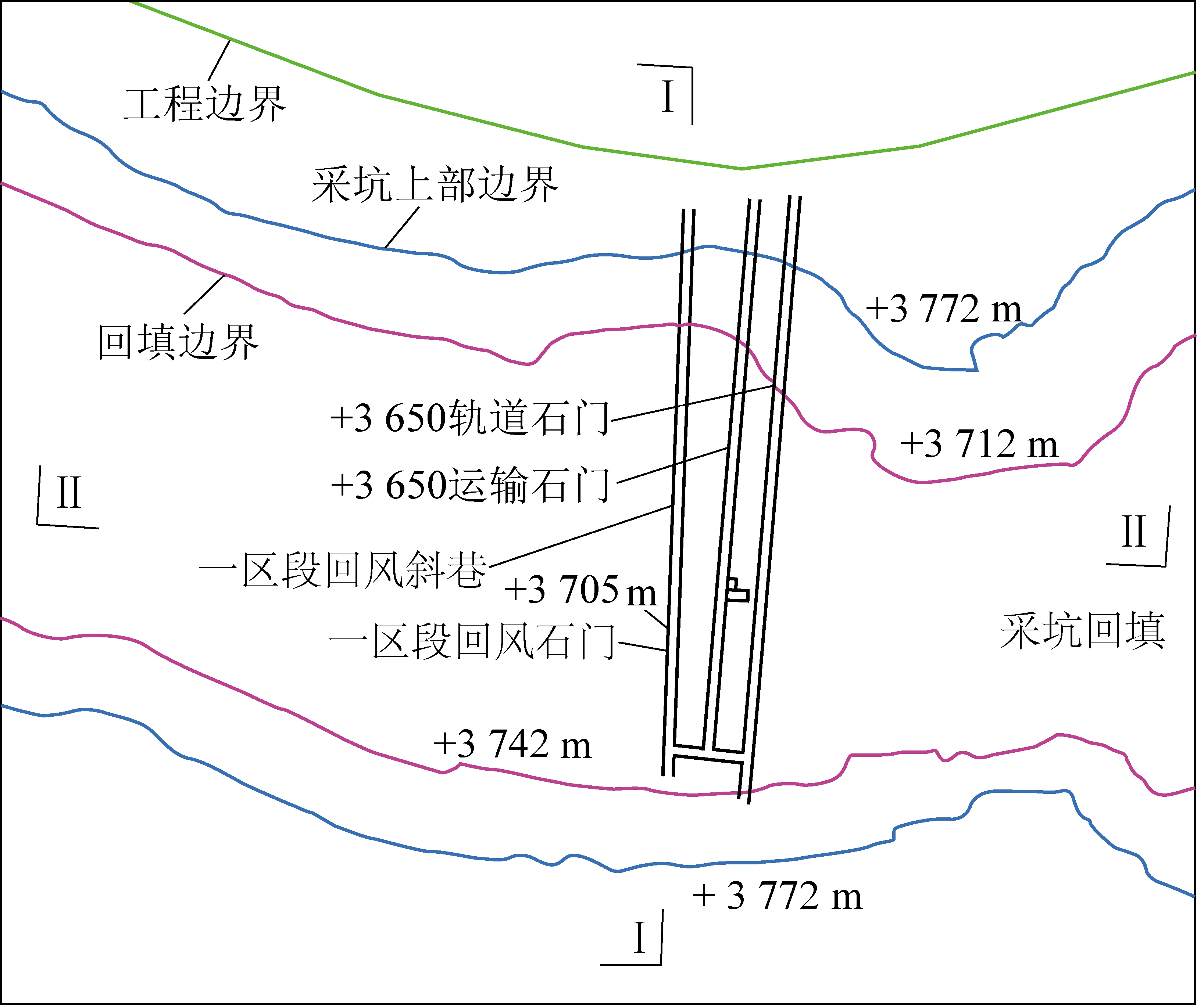 江仓一号矿海拔高度+3 670~+3 815 m,属于高寒高海拔地区,目前地面已形成了最大深度约120 m,坑口面积约70.2万 m3,容积约2 727万 m3的露天采坑,采坑下方是井工矿一区段的准备巷道系统。井工矿开拓方式为斜井多水平片盘开拓,设主、副、风3条井筒,井下一水平标高为+3 450 m。井下巷道与采坑回填体位置关系平面如图1所示,沿一区段回风石门做倾向剖面Ⅰ—Ⅰ和走向剖面Ⅱ—Ⅱ如图2所示。图中显示距离采坑底部最近的有3条巷道:一区段回风斜巷、+3 650运输石门和+3 650轨道石门。一区段回风斜巷距离地表采坑最近处只有27.07 m。一区段回风斜巷、+3 650运输石门和+3 650运输石门断面都为半圆拱,现有支护方式为锚网喷支护。