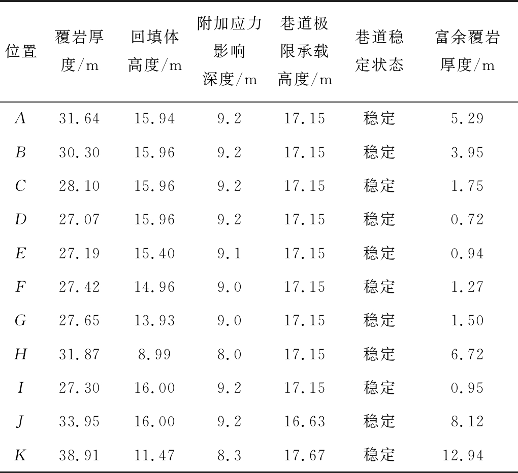 位置覆岩厚度/m回填体高度/m附加应力影响深度/m巷道极限承载高度/m巷道稳定状态富余覆岩厚度/mA31.6415.949.217.15稳定5.29B30.3015.969.217.15稳定3.95C28.1015.969.217.15稳定1.75D27.0715.969.217.15稳定0.72E27.1915.409.117.15稳定0.94F27.4214.969.017.15稳定1.27G27.6513.939.017.15稳定1.50H31.878.998.017.15稳定6.72I27.3016.009.217.15稳定0.95J33.9516.009.216.63稳定8.12K38.9111.478.317.67稳定12.94