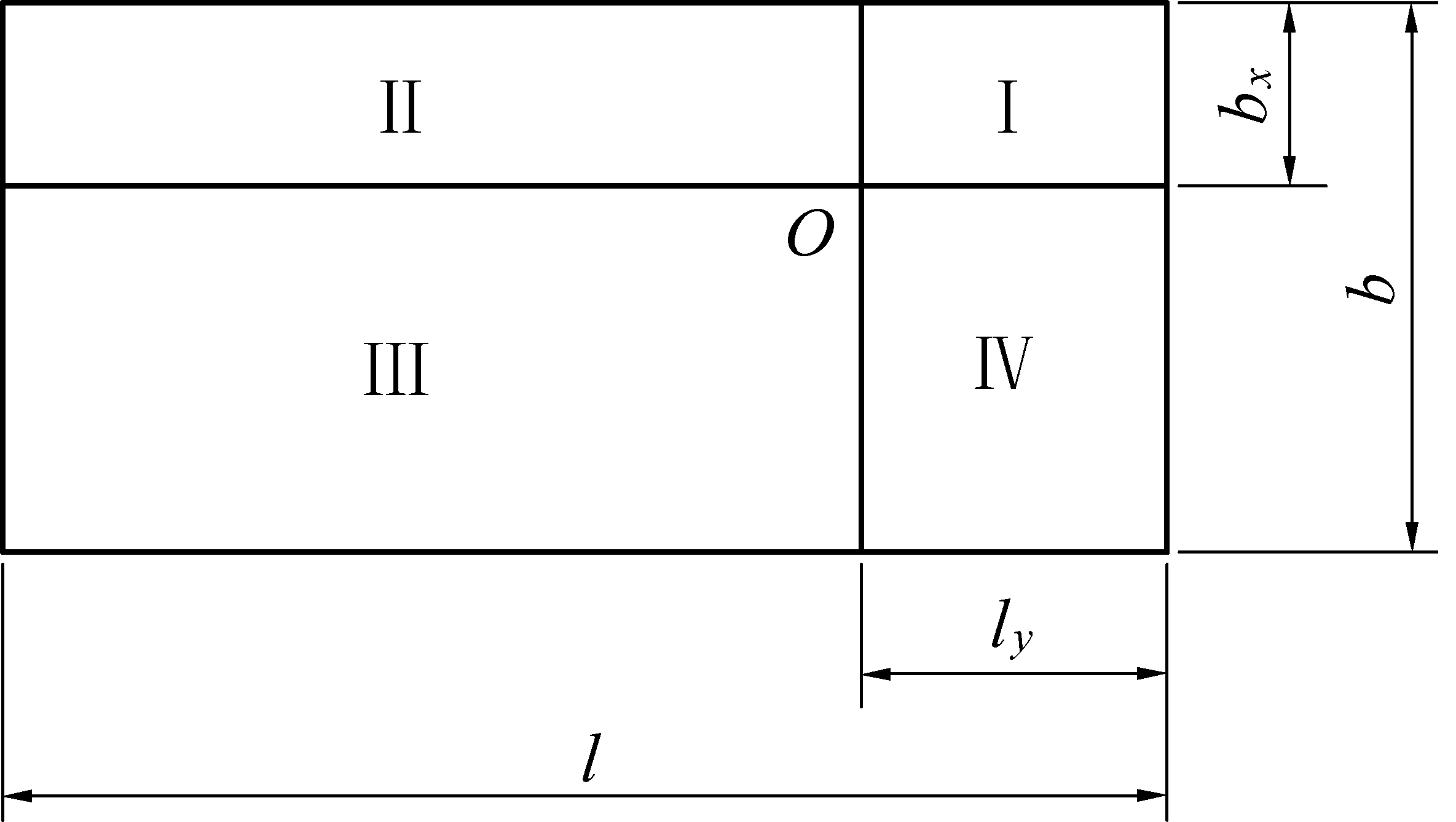 考虑更一般的情况,对矩形平面下任一点M,深度为z,如图5所示,在平面上的投影为O。平面图分为Ⅰ,Ⅱ,Ⅲ,Ⅳ四个矩形。