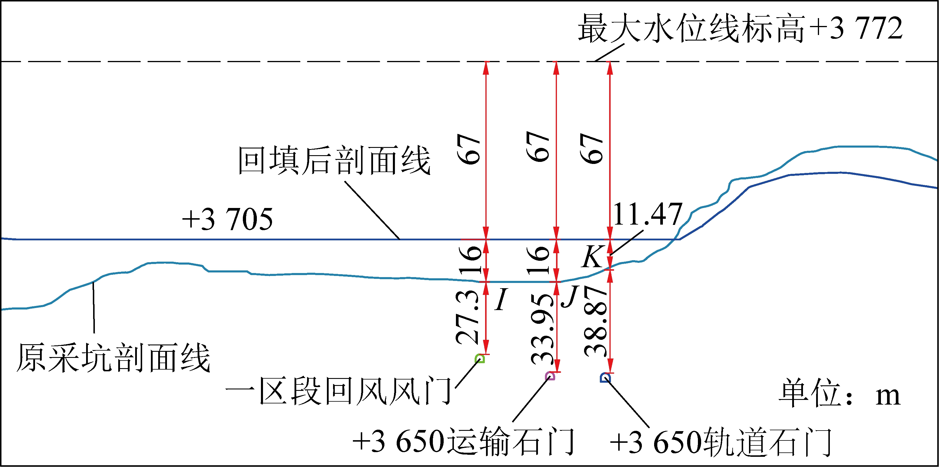 回填后,预计采坑内积水最终标高为+3 772 m。考虑回填体上方水体按其深度产生的自重加到巷道覆岩上,此时,