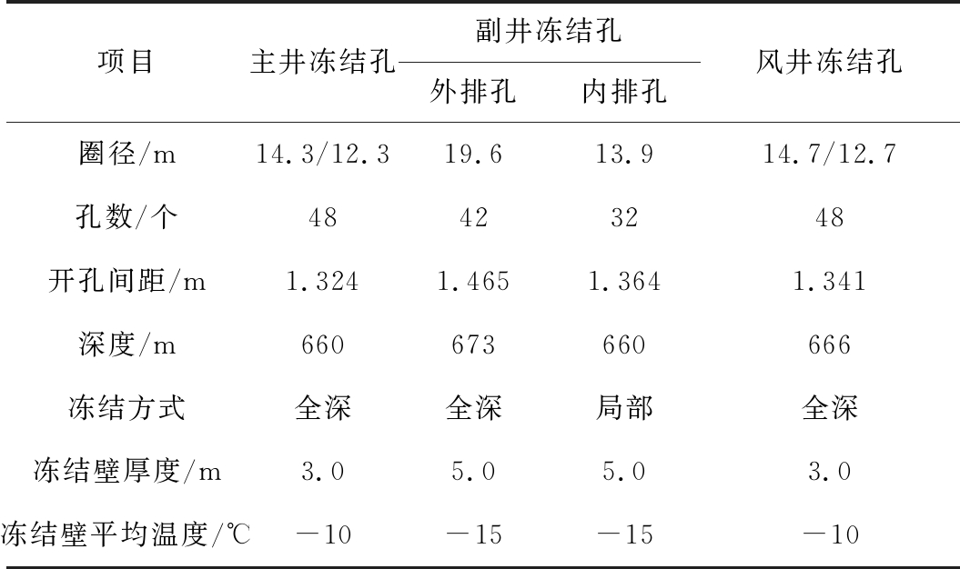 项目主井冻结孔副井冻结孔外排孔内排孔风井冻结孔圈径/m14.3/12.319.613.914.7/12.7孔数/个48423248开孔间距/m1.3241.4651.3641.341深度/m660673660666冻结方式全深全深局部全深冻结壁厚度/m3.05.05.03.0冻结壁平均温度/℃-10-15-15-10