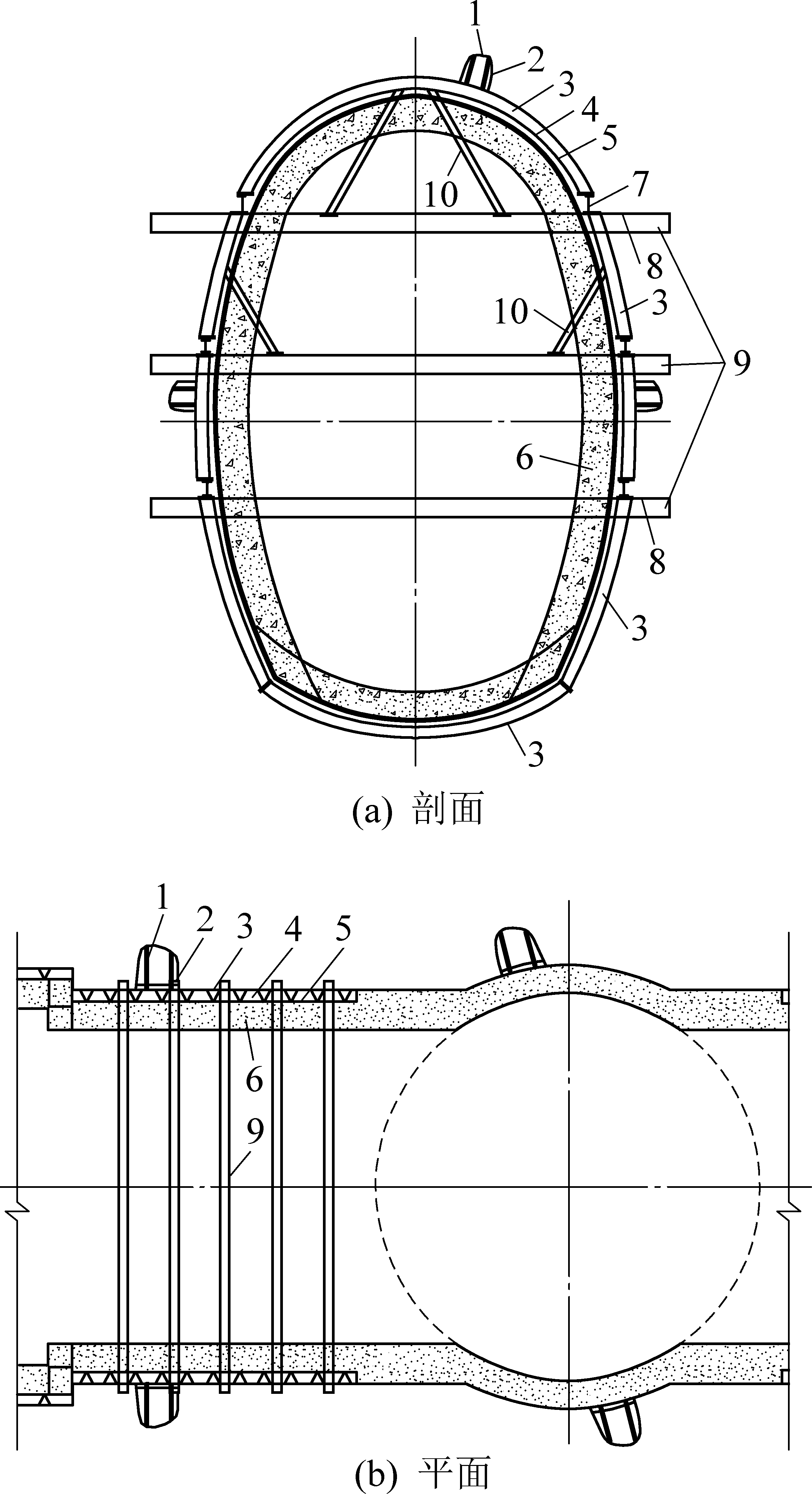 1—锚杆索、钢筋网;2—喷层;3—U36型钢支架;4—混凝土复喷层;5—可压缩层;6—钢筋钢纤维混凝土碹体;7—腰梁;8—锚固短锚杆;9—对撑;10—斜撑
