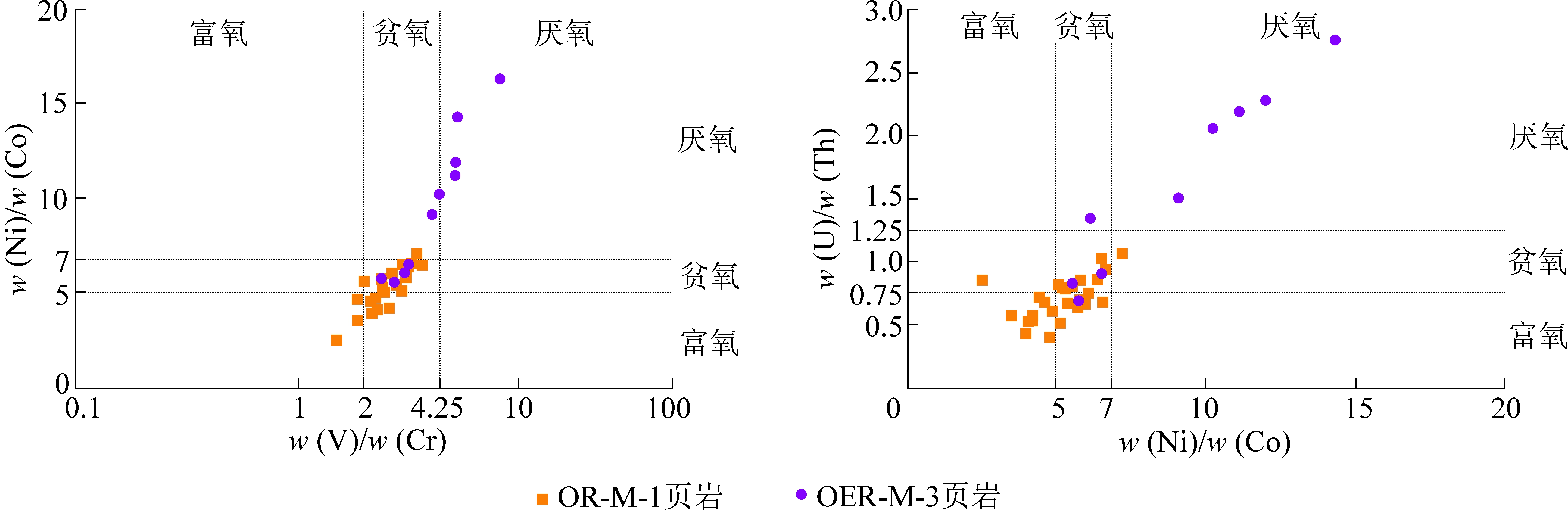 岩相段OR-M-1页岩的w(V)/w(Cr)、w(Ni)/w(Co)和w(U)/w(Th)为1.51~3.66(平均2.59)、2.51~7.13(平均5.16)和0.42~1.08(平均0.71);主要位于