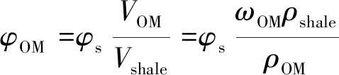 式中:φOM为有机质孔隙度,%;φs为扫描电镜图像的表面有机质孔隙度,%;VOM为有机质体积,cm3;Vshale为页岩体积,cm3;ωOM为有机质质量分数(即有机碳含量),%;ρOM为有机质密度,g/cm3;ρshale为页岩密度,g/cm3。
