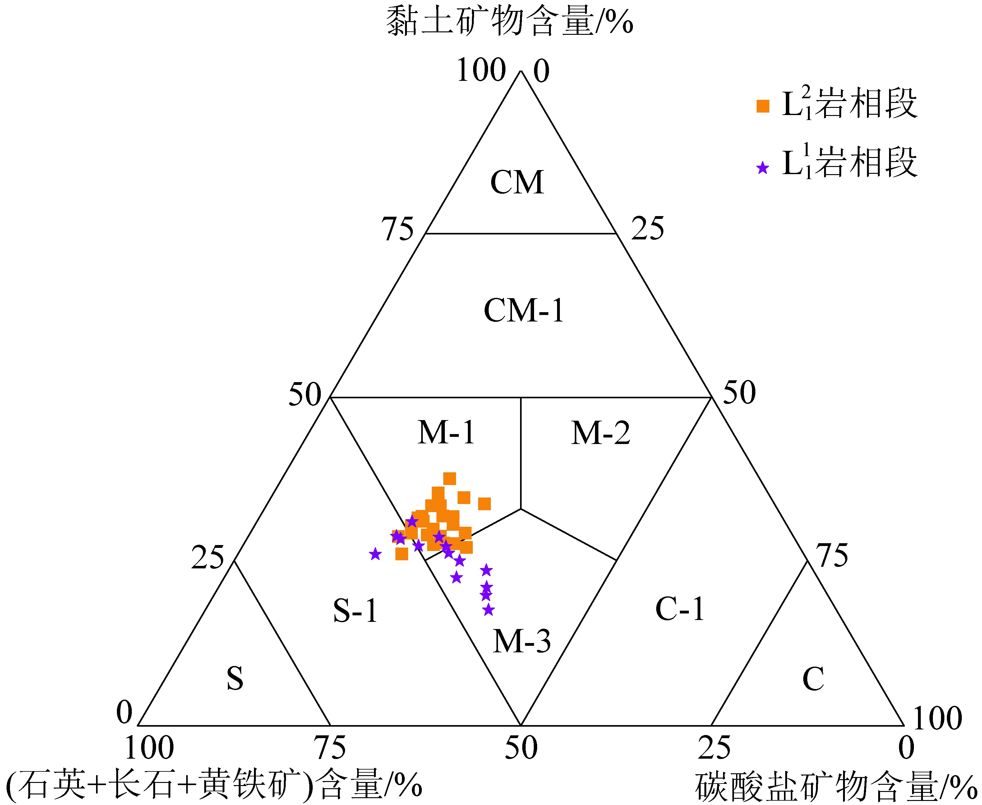 根据SY/T5163—2010《沉积岩中黏土矿物和常见非黏土矿物X射线衍射分析》,采用日本Rigaku公司研制的RINTT-TTR3装置,对样品进行了矿物成分测试。采用石英+长石+黄铁矿、碳酸盐矿物(方解石+白云石)和黏土矿物(高岭石+绿泥石+伊利石+蒙脱石+伊利石-蒙脱石混合层+绿泥石-蒙脱石混合层)作为三元图的三端(由于黄铁矿主要形成于成岩早期的缺氧环境,考虑页岩的成因,兼顾可压性,因此将其归于左端元)[16],按50%的组成比例,将岩相划分为4种类型:硅质页岩(硅质矿物含量>50%)、钙质页岩(钙质矿物含量>50%)、泥质页岩(黏土矿物含量>50%)、混合页岩(硅质、钙质、泥质矿物各含量<50%)。其次,通过考虑三元图中所显示的25%、50%和75%的临界矿物含量值,对9个二级岩相进行分类(图3)。