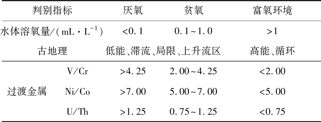 沉积学上的沉积环境通常是指沉积作用进行时的综合地理环境。在沉积作用进行过程中,沉积物中的微量元素也会随之迁移汇聚。在不同的沉积环境中包括介质性质、温度、水动力条件、物理化学作用和古地貌特征也各有不同。因此,不同沉积环境中的元素含量特征存在规律,从而可以利用元素地球化学特征进行沉积环境的识别和恢复。元素地球化学方法被广泛的应用于沉积环境研究,可通过多种指标进行解释[17-18]。传统的氧化还原环境判别标准w(V)/w(Cr)、w(Ni)/w(Co)、w(U)/w(Th)可以作为沉积古环境的判别指标[19](表2)。