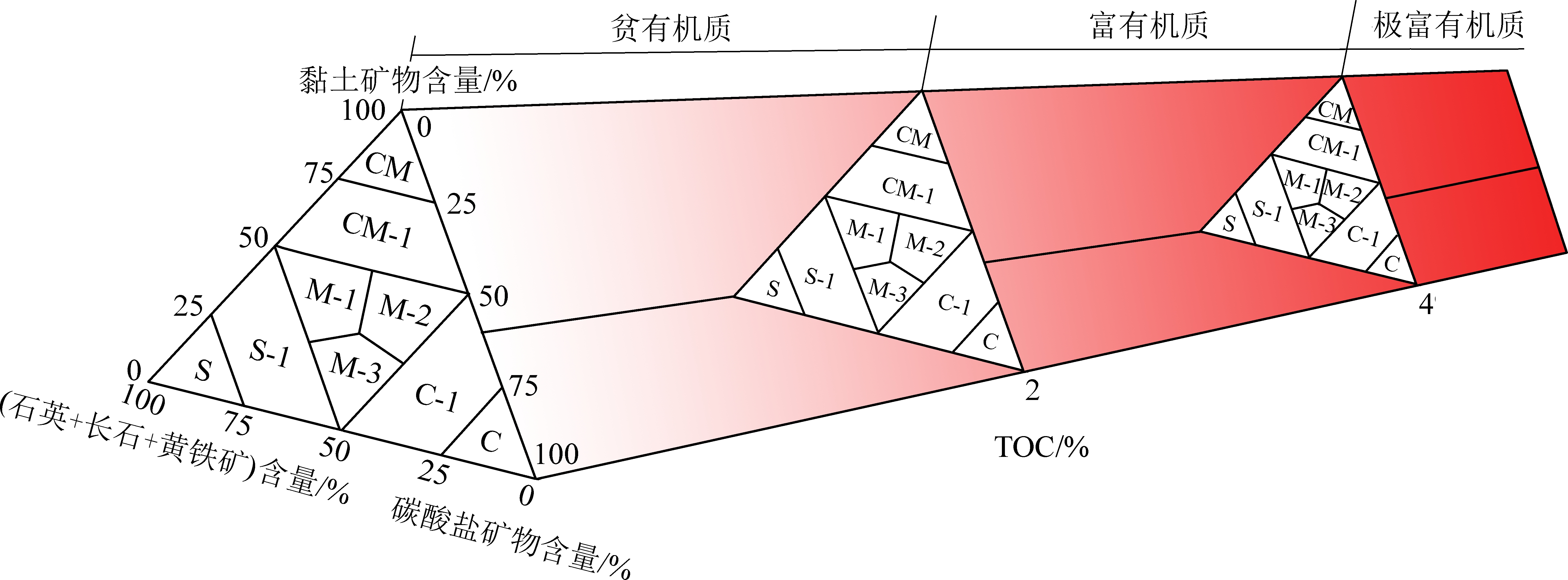 岩相段M-3岩相的硅质矿物、黏土矿物和碳酸盐矿物含量分别是32.10%~47.10%、17.50%~27.30%和27.60%~40.70%,平均分别为43.55%、23.68%和32.77%。M-1和M-3页岩的有机碳含量是1.55%~4.76%和2.56%~7.35%,平均为2.68%和4.86%(表1)。因此,结合TOC页岩岩相划分方案,L1段主要发育富有机质黏土质-硅质混合岩相页岩(OR-M-1)和极富有机质钙质-硅质混合岩相页岩(OER-M-3)(图2)。龙马溪组L1段页岩垂向上由上到下