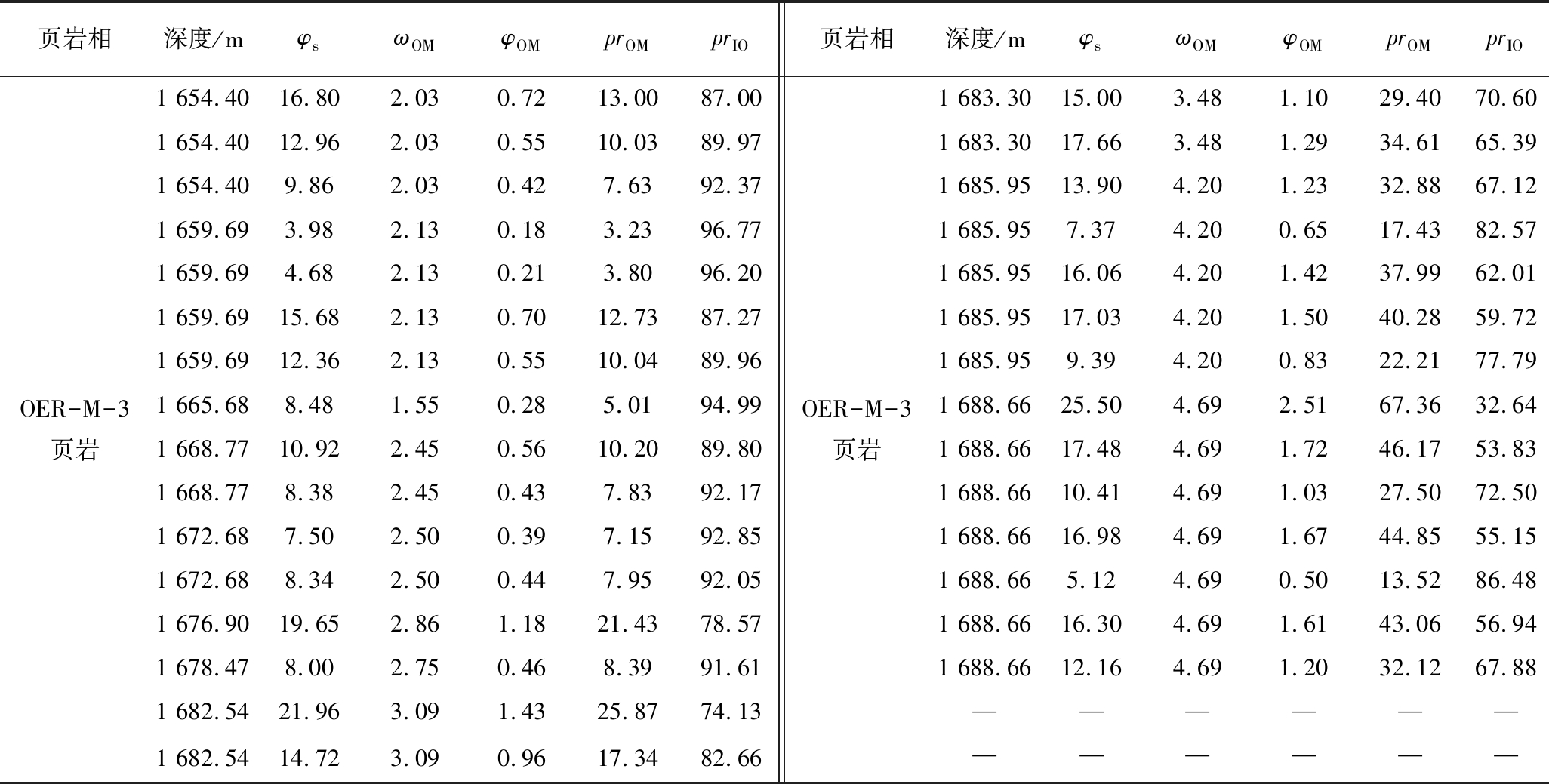 页岩相OER-M-3页岩深度/mφsωOMφOMprOMprIO1 654.4016.802.030.7213.0087.001 654.4012.962.030.5510.0389.971 654.409.862.030.427.6392.371 659.693.982.130.183.2396.771 659.694.682.130.213.8096.201 659.6915.682.130.7012.7387.271 659.6912.362.130.5510.0489.961 665.688.481.550.285.0194.991 668.7710.922.450.5610.2089.801 668.778.382.450.437.8392.171 672.687.502.500.397.1592.851 672.688.342.500.447.9592.051 676.9019.652.861.1821.4378.571 678.478.002.750.468.3991.611 682.5421.963.091.4325.8774.131 682.5414.723.090.9617.3482.66页岩相OER-M-3页岩深度/mφsωOMφOMprOMprIO1 683.3015.003.481.1029.4070.601 683.3017.663.481.2934.6165.391 685.9513.904.201.2332.8867.121 685.957.374.200.6517.4382.571 685.9516.064.201.4237.9962.011 685.9517.034.201.5040.2859.721 685.959.394.200.8322.2177.791 688.6625.504.692.5167.3632.641 688.6617.484.691.7246.1753.831 688.6610.414.691.0327.5072.501 688.6616.984.691.6744.8555.151 688.665.124.690.5013.5286.481 688.6616.304.691.6143.0656.941 688.6612.164.691.2032.1267.88————————————