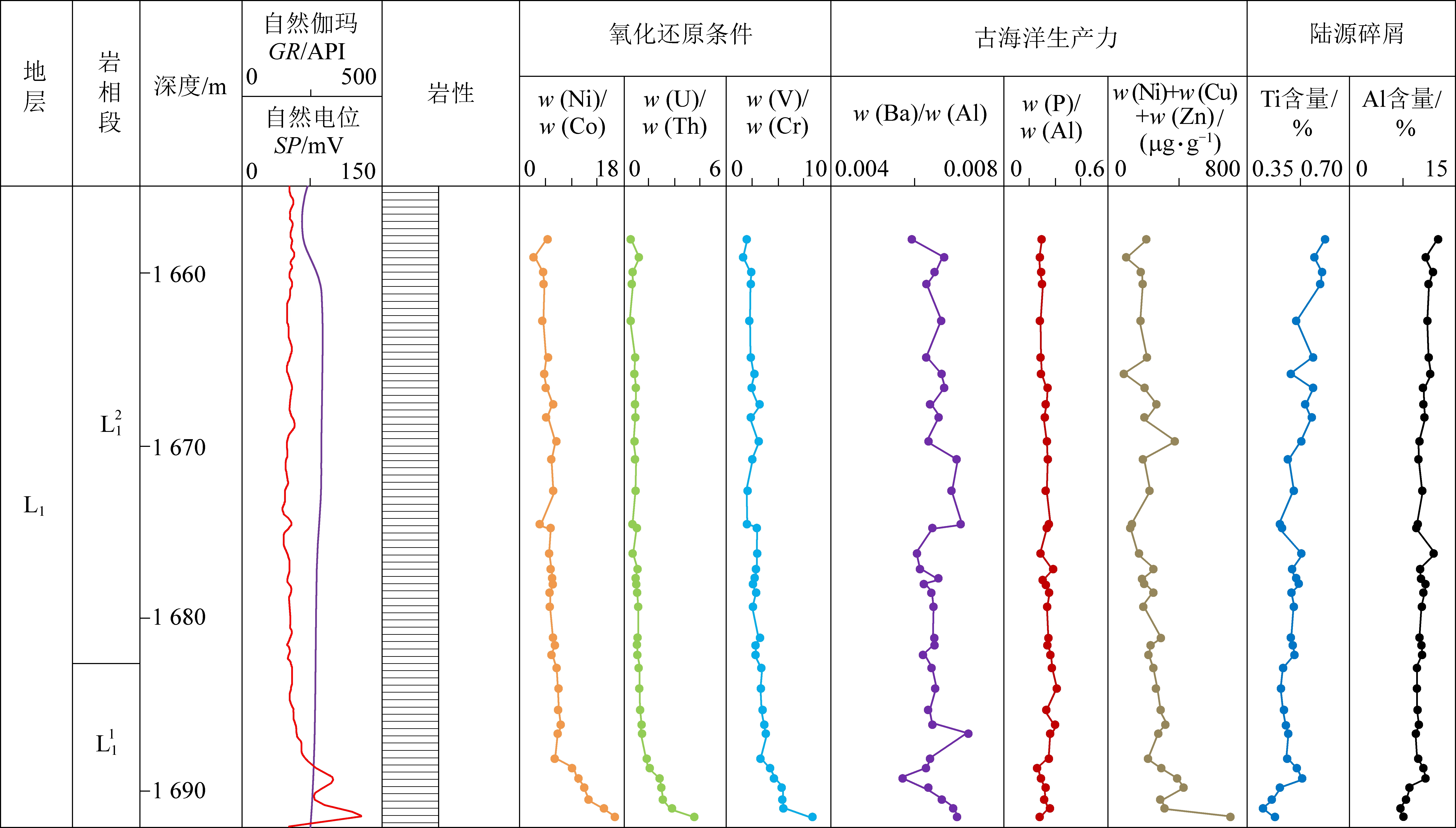 图5 Y5井龙马溪组L1段氧化还原指标、古海洋生产力指标和陆源碎屑指标
