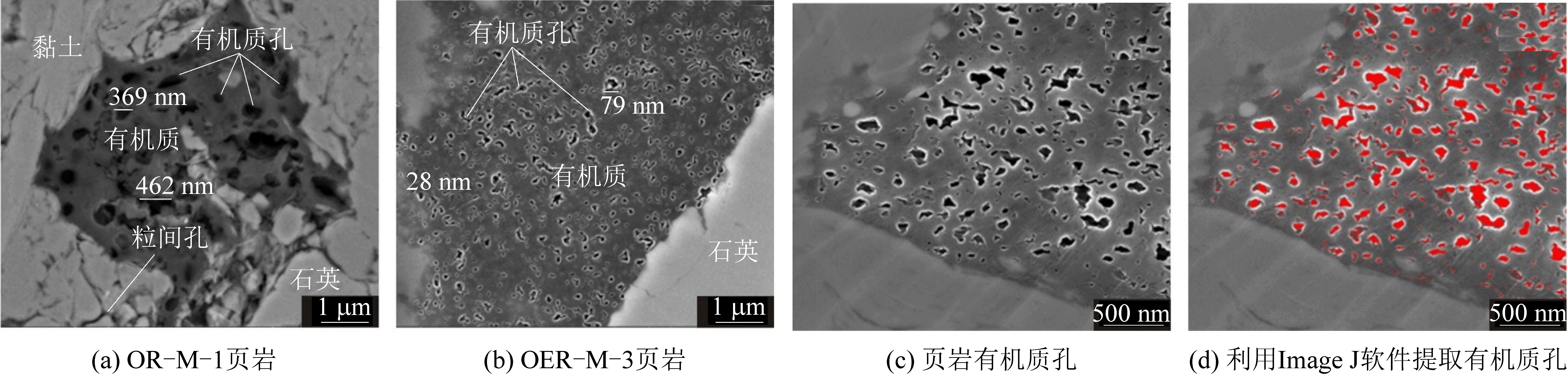 通过FE-SEM图像可以观察到2种岩相有机质孔发育存在明显差异,即与OR-M-1页岩相比,OER-M-3页岩的有机质孔更为发育(图8a、图8b)。利用SHI等[30]提出的有机质孔隙度计算方法,定量分析了OR-M-1和OER-M-3两种混合岩相页岩有机质孔隙度和有机质孔隙体积比大小,即