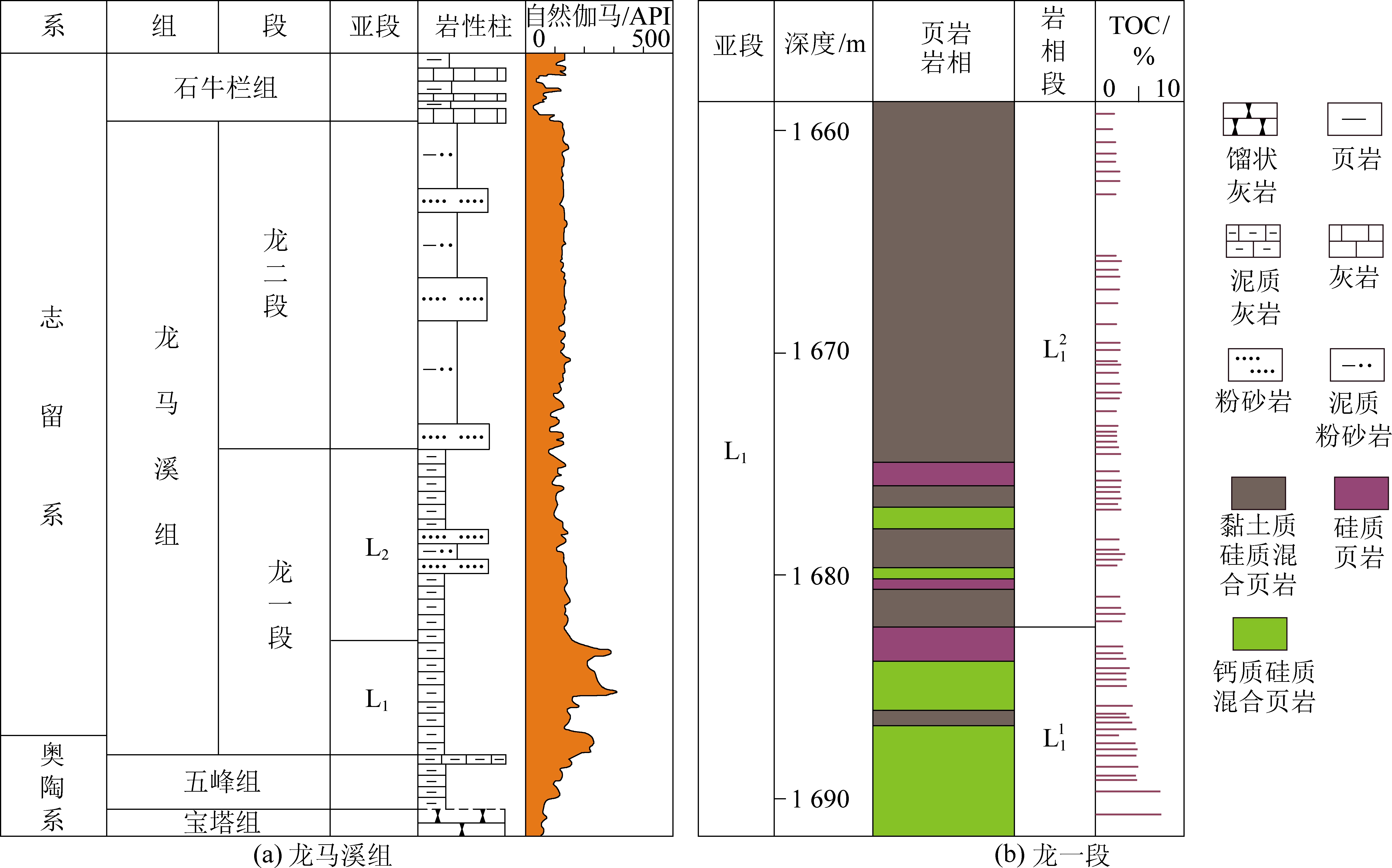 龙马溪组纵向上依据岩性、电性和笔石化石特征划分为龙马溪组一段(下称龙一段)和龙马溪组二段(下称龙二段)2个岩性段,龙一段沉积于龙马溪组早期,以黑色硅质、炭质页岩和灰黑色钙质泥岩组合为主,龙二段沉积于龙马溪组后期,以灰绿色、黄绿色泥岩、泥质粉砂岩和粉砂岩组合为主。其中龙一段又细分为龙一1亚段(L1)与龙一2亚段(L2);龙马溪组L1亚段以黑色硅质页岩与炭质页岩为主,富含黄铁矿和笔石化石(图2)。目前龙马溪组页岩气勘探开发的主力产层是L1亚段,因此笔者主要对其开展相关研究。
