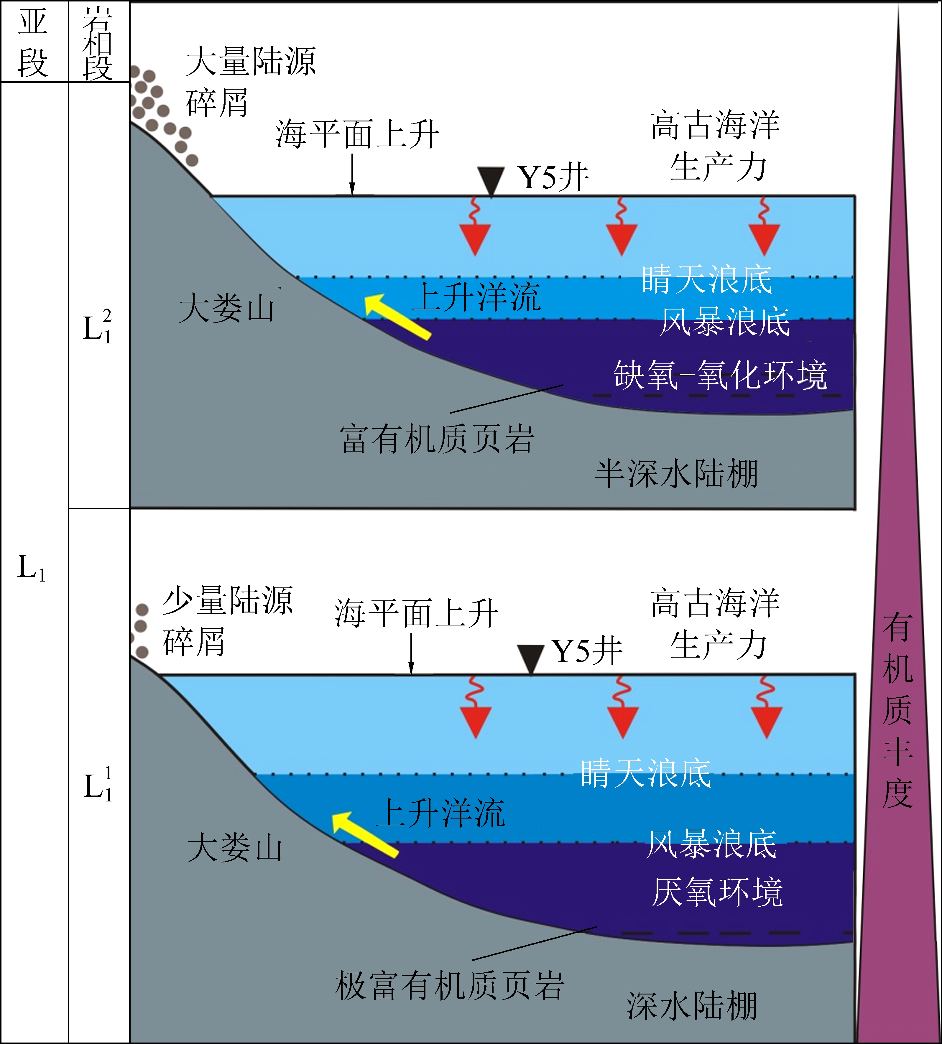沉积阶段处于海侵初期,由海平面上升而形成的上升洋流涌向海面表层,为上层海水中的浮游生物提供了丰富的营养物质,从而形成高古海洋生产力的环境,而位于风暴浪基面以下的海水一直保持平静的缺氧状态,有利于有机质的保存。