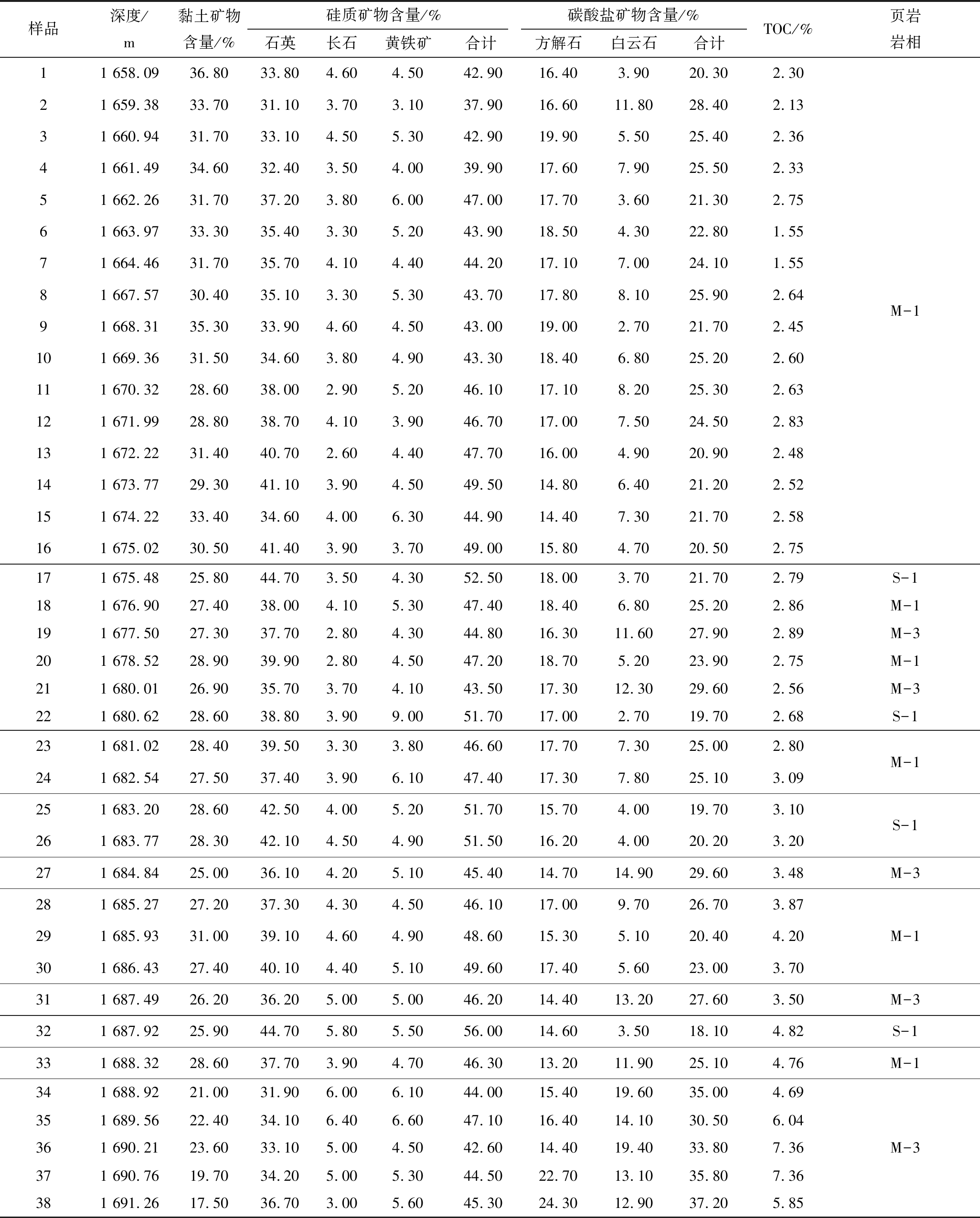 岩相段)有机质丰度明显增高,黏土矿物含量明显降低,碳酸盐矿物含量明显增高,而硅质矿物含量略有降低(图2、表1)。