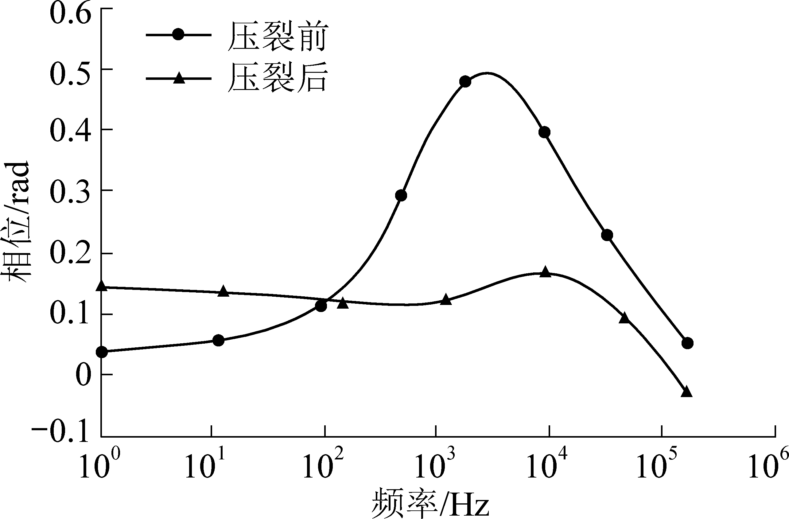 由图4可知:压裂前复电阻率的相位(相位是负值,以绝对值表示)呈两段式。低频时,随频率的增大而增大;高频时,随频率的增大而减小。压裂后,呈三段式,随频率的增大出现略微减小-增大-减小的现象。低频段,压裂后的相位大于压裂前的相位;高频段,压裂前的相位大于压裂后的相位。
