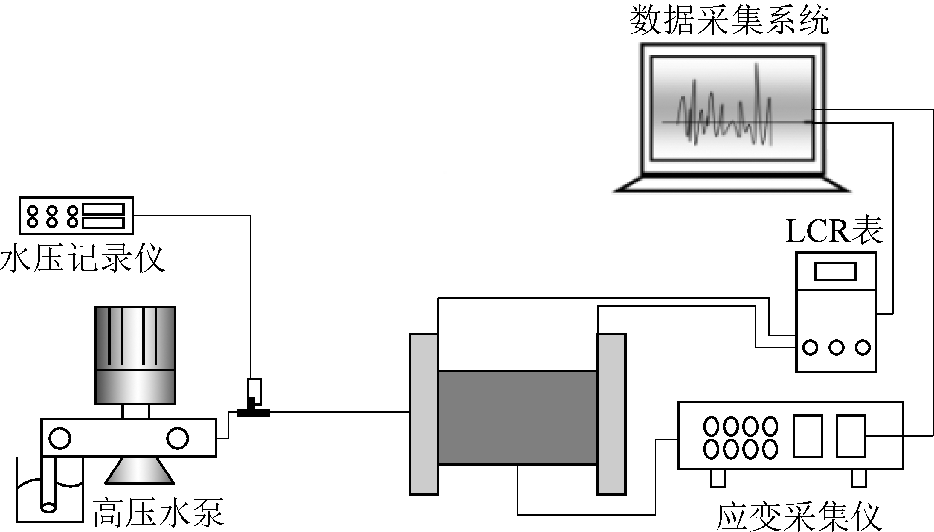 水力压裂测量系统如图2所示。试验开始前,在煤样轴向端钻ø3.5 mm×50 mm的压裂孔,将压裂管放入钻孔,预留5 mm的裸孔用于压裂,并用环氧树脂密封,待密封完全后,将其放入水中,使其完全饱和;控制电流大小不变,在0~200 kHz频率范围内,测量压裂前饱和水煤样的电容、复阻抗的模值和相位,然后打开高压水泵,采用恒压恒流的方式压裂煤样(由于采用环氧树脂密封,破裂压力达到14 MPa,流量为1 mL/s)。期间,在煤样壁面贴上应变片,连接应变仪(采样周期为0.02 s),采集压裂过程应变数据,直至煤样壁面出水,采集压裂后饱和水煤样的复电性数据,关闭水泵。