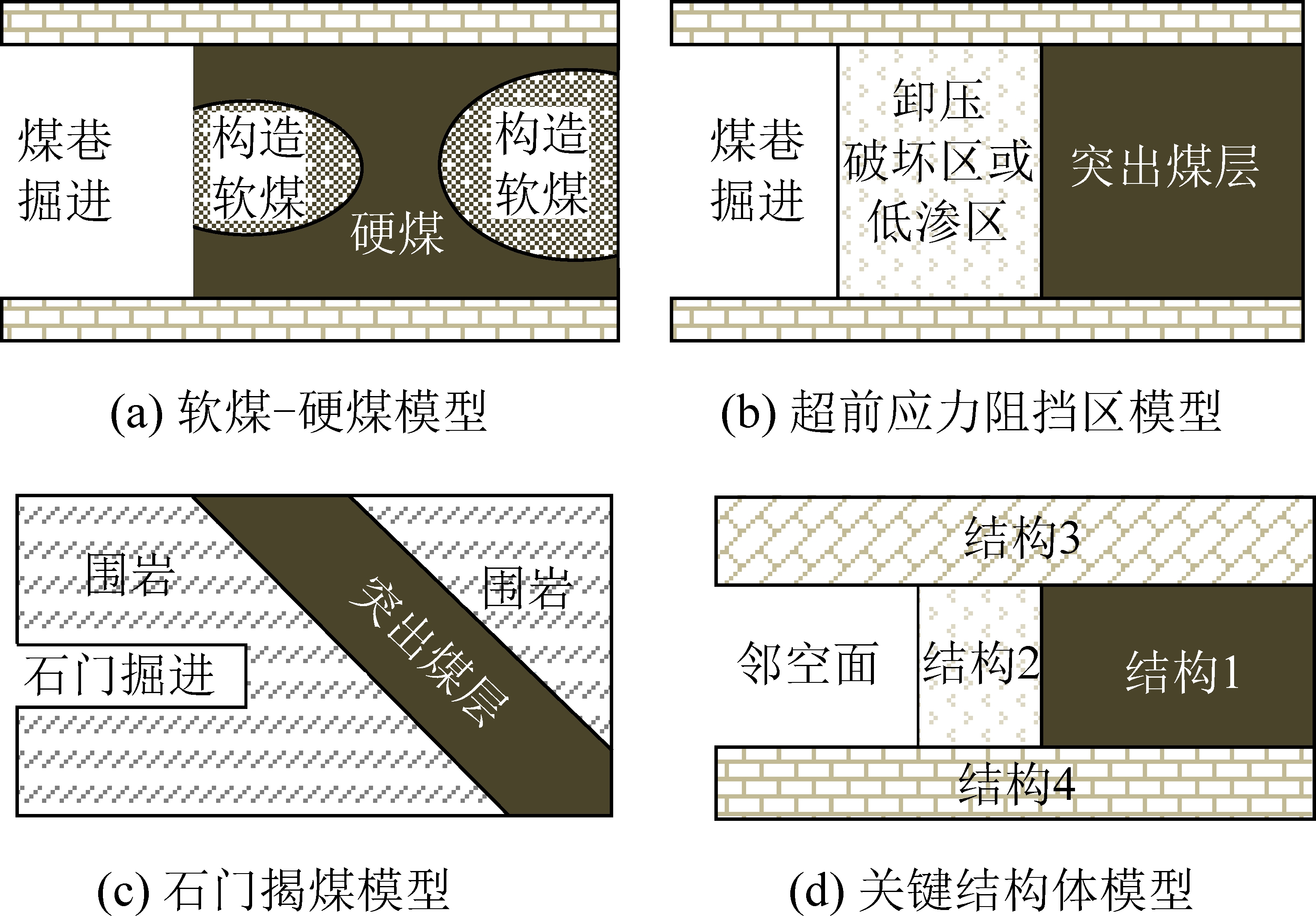 通过对国内外相关物理简化模型进行统计可知,其通常可分为4种模型即硬煤-软煤变化型、超前应力形成阻挡区型、石门揭煤突出型及关键结构模型(图9)。