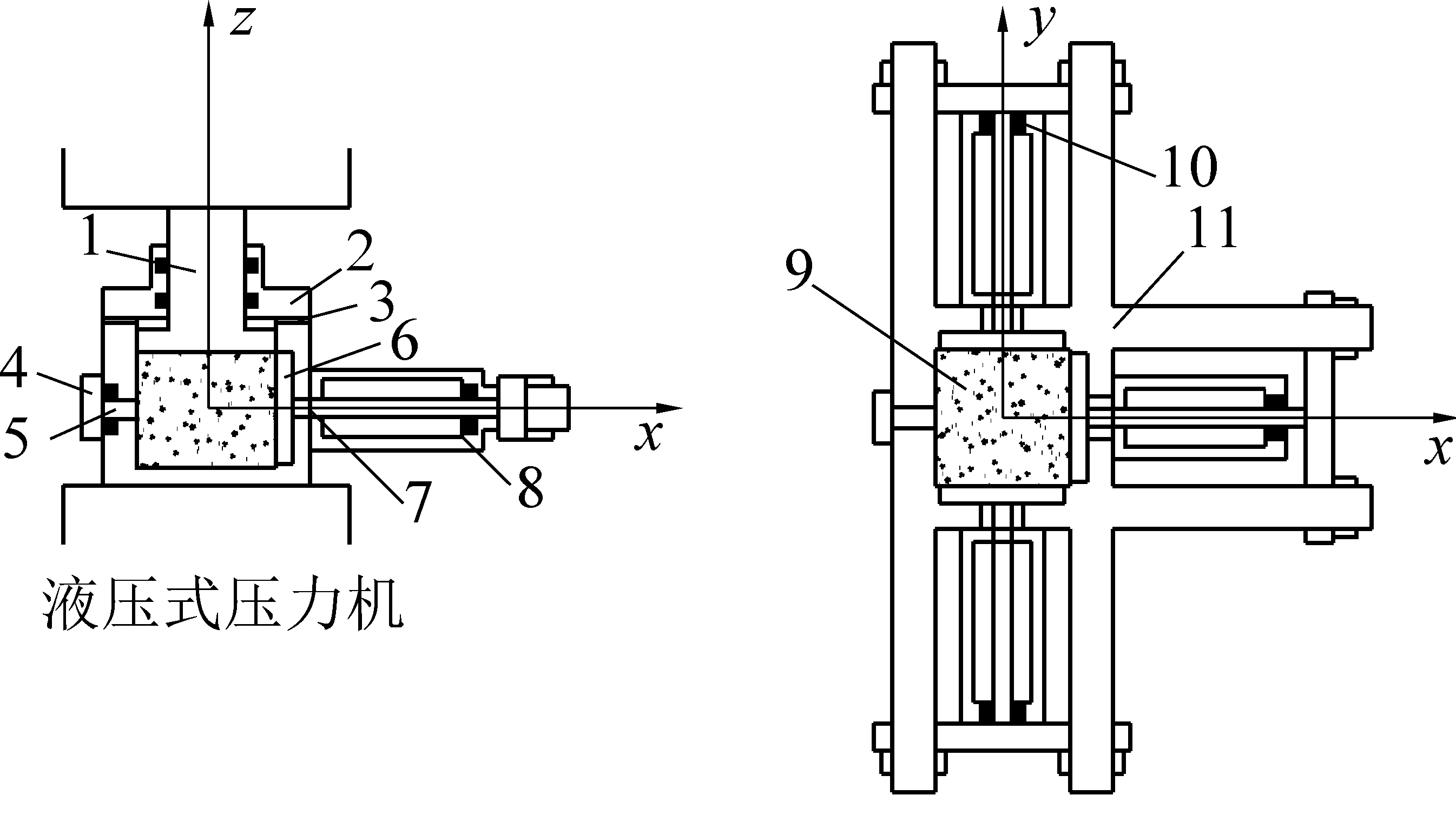 1—活塞;2—顶盖;3——密封垫;4—突出口顶板;5—突出口;6—侧向承压板;7—油缸活塞;8—侧向专用油缸;9—煤样;10—O形圈;11—装置底座