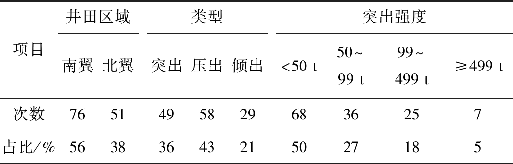 项目井田区域南翼北翼类型突出压出倾出突出强度<50 t50~99 t99~499 t≥499 t次数76514958296836257占比/%56383643215027185