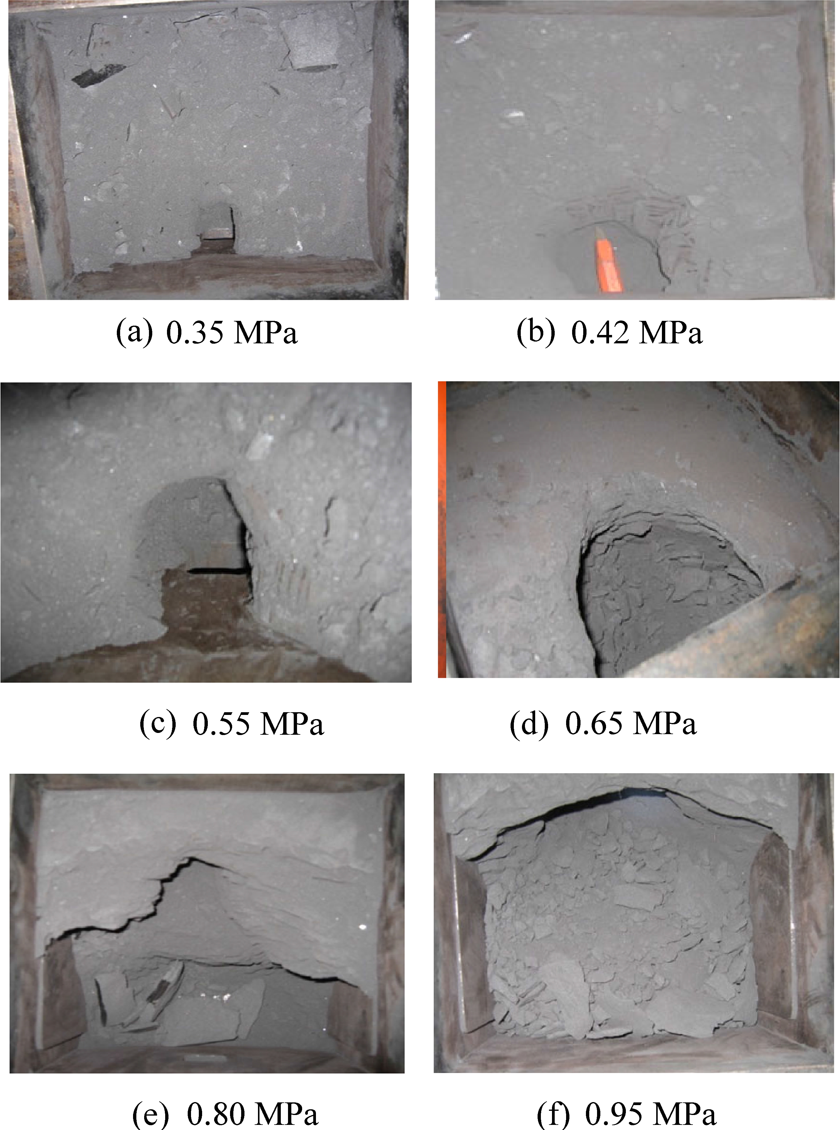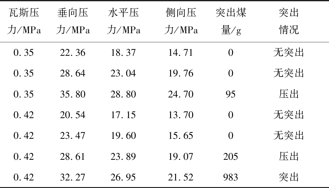 瓦斯压力/MPa垂向压力/MPa水平压力/MPa侧向压力/MPa突出煤量/g突出情况0.3522.3618.3714.710无突出0.3528.6423.0419.760无突出0.3535.8028.8024.7095压出0.4220.5417.1513.700无突出0.4223.4719.6015.650无突出0.4228.6123.8919.07205压出0.4232.2726.9521.52983突出