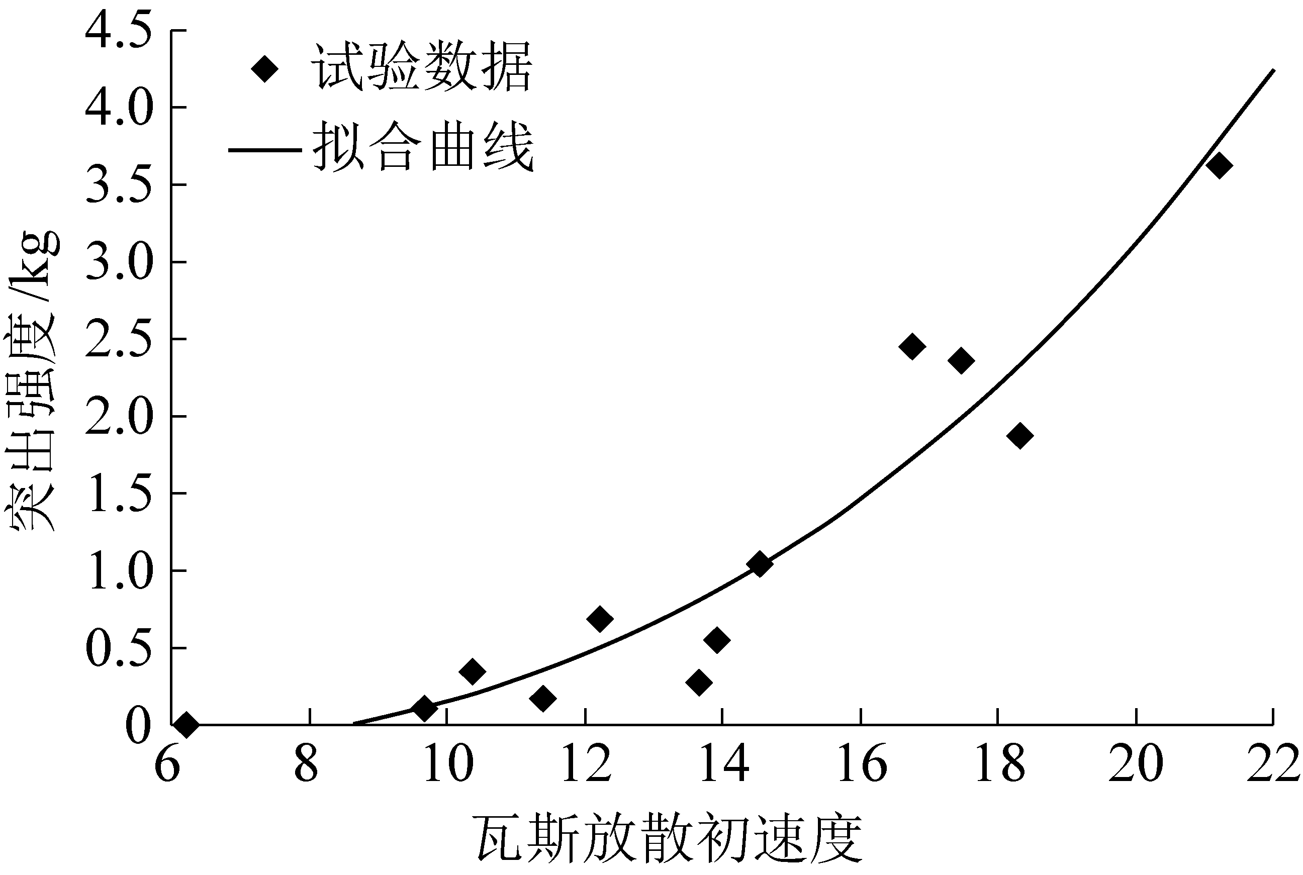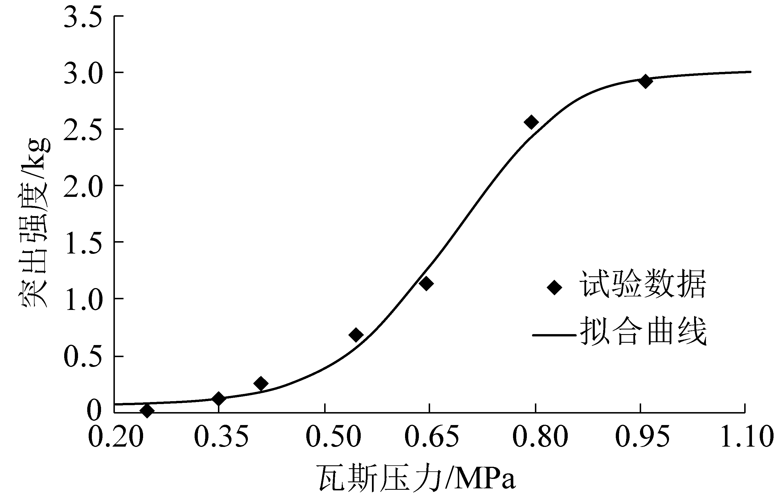 试验表明,瓦斯压力为0、0.15、0.25 MPa时,施加不同应力均不发生动力现象;当瓦斯压力达到0.35 MPa时发生动力现象,说明瓦斯压力是突出的必要条件。采用最小二乘法对数据拟合,可得到瓦斯压力与突出强度的经验公式: