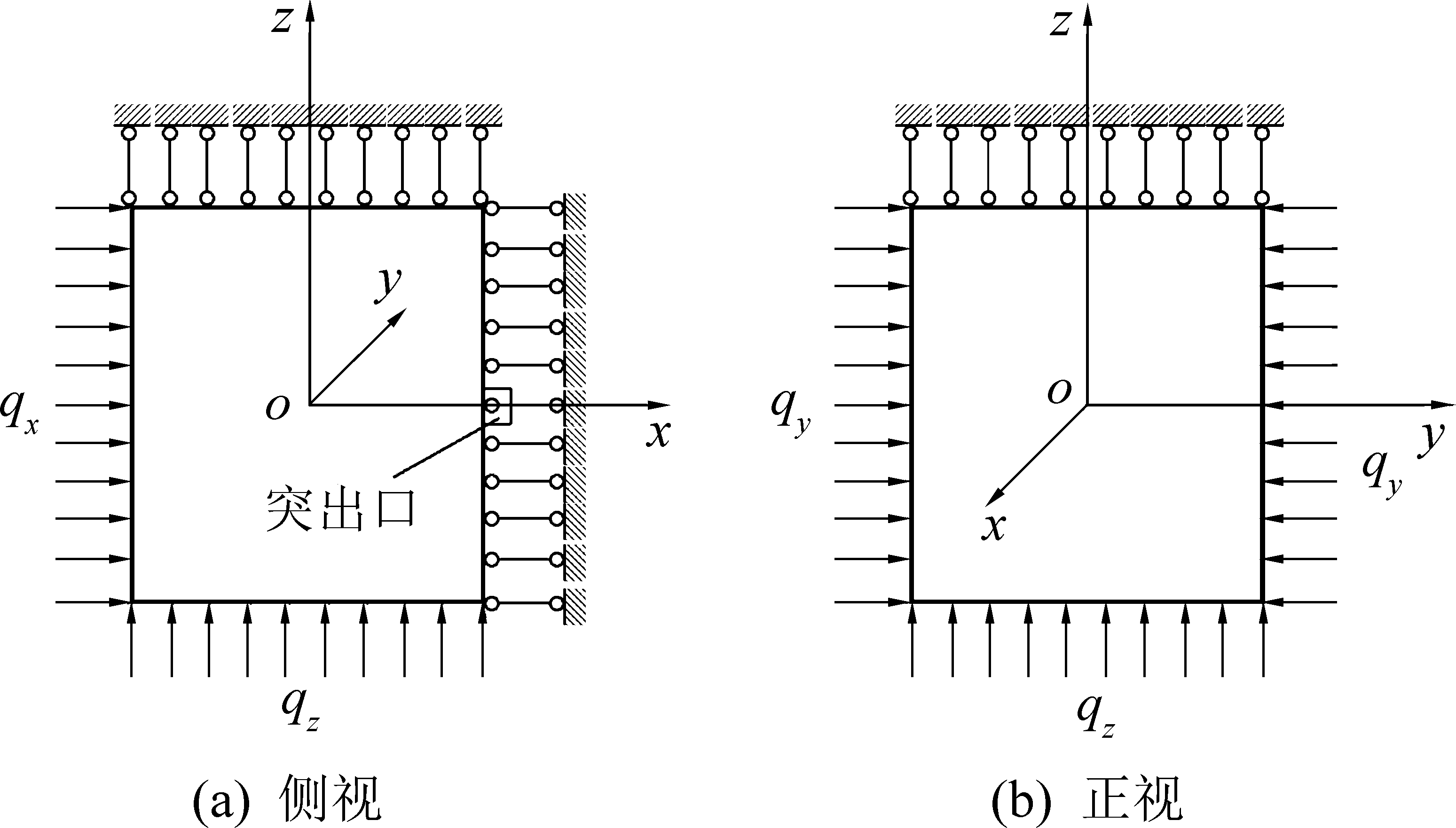 试验采用型煤煤样进行,并作如下假设:各向同性,应力与应变成阶段线弹性,巷道形状简化为矩形,符合均布面力边界条件。力学模型如图3所示,其中x方向(水平方向)为突出口方向,即突出孔洞主轴方向,位移为0;y仍为水平方向,但与突出孔洞主轴方向垂直(以下称侧向),面力边界条件,施加约束力qx、qy;顶部为伺服试验机承压板,位移为0;底部为试验机油缸,面力边界条件,施加约束力qz。