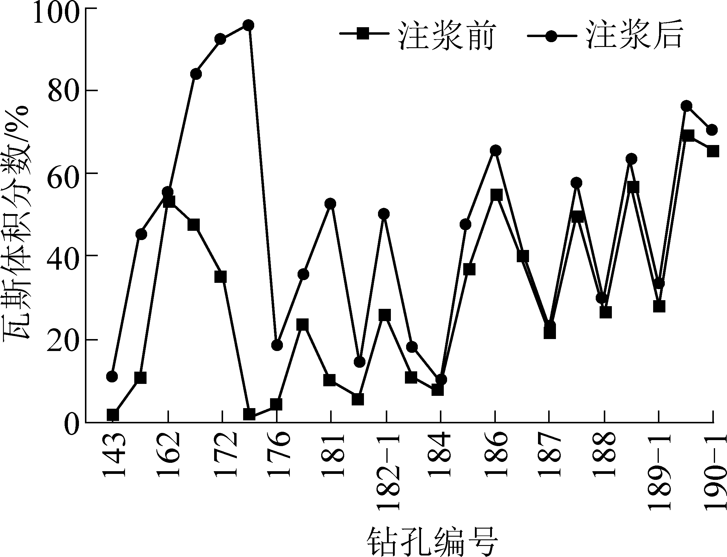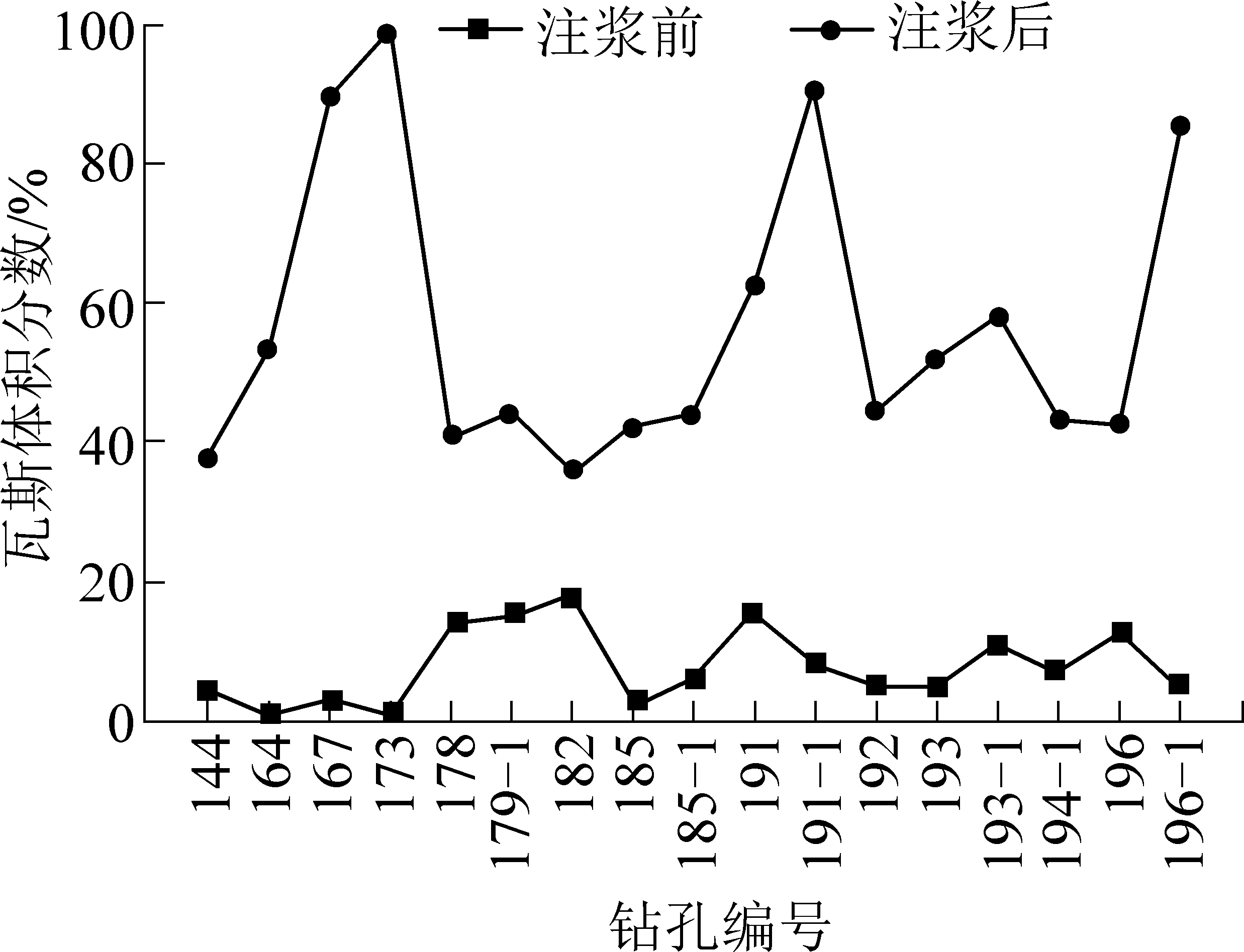 由图8可知,试验钻孔注浆后瓦斯抽采体积分数总体提升至35%~80%,部分钻孔瓦斯抽采体积分数提升至接近100%。例如173、191-1号钻孔,注浆前瓦斯抽采体积分数分别为1.2%、8.2%,注浆后瓦斯抽采体积分数达到98%、90.4%,瓦斯抽采体积分数提升非常明显。试验钻孔注浆后瓦斯抽采体积分数提升最低的是195-1号钻孔,瓦斯抽采体积分数达到35.2%。试验孔178—185号区间内的钻孔注浆后瓦斯抽采体积分数为35%~45%,提升水平较其他钻孔偏低,分析原因可能是该区间内钻孔之前有串孔而导致的。试验结果与模型理论分析相吻合,试验孔整体提升水平较高,充分证明了对于失效钻孔失效机制分析的准确性以及装备制作的精密性高效性。