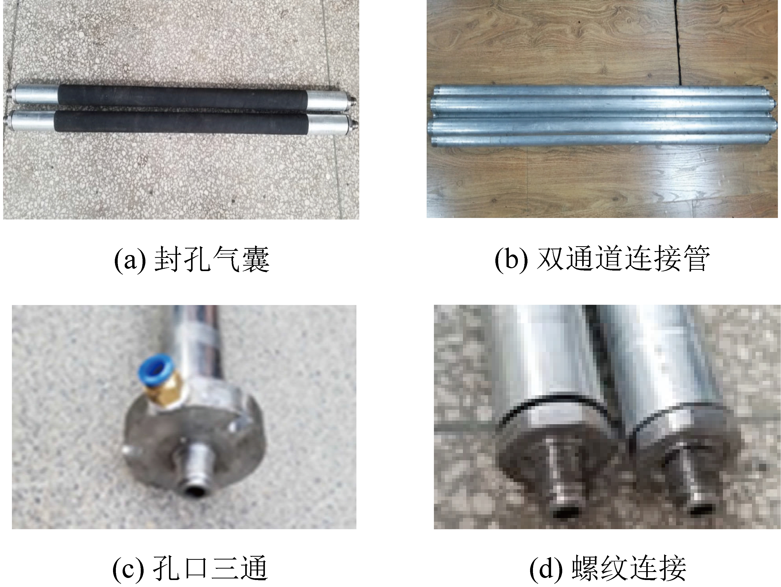 双通道连接管是向气囊输送高压气体(图4b),向孔内输送注浆液的关键部件,单根长度1.5 m,其材质为不锈钢,采用同心结构,其中内管内径14 mm,外径28 mm,壁厚7 mm;外管内径38 mm,外径45 mm,壁厚3.5 mm。管的两端采用螺纹连接,并加装不同尺寸“O”形密封圈,确保了装置的气密性。注浆管长度尺寸与连接管相同,区别在于注浆管上开有注浆孔,注浆孔位置在注浆管的2/3的位置处。
