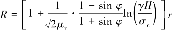 式中:R为卸压带半径;μr为摩擦因数,取0.4;φ为煤的内摩擦角;r为钻孔半径;γ为岩体容重;H为原始岩体垂深;σc为煤的单轴抗压强度。