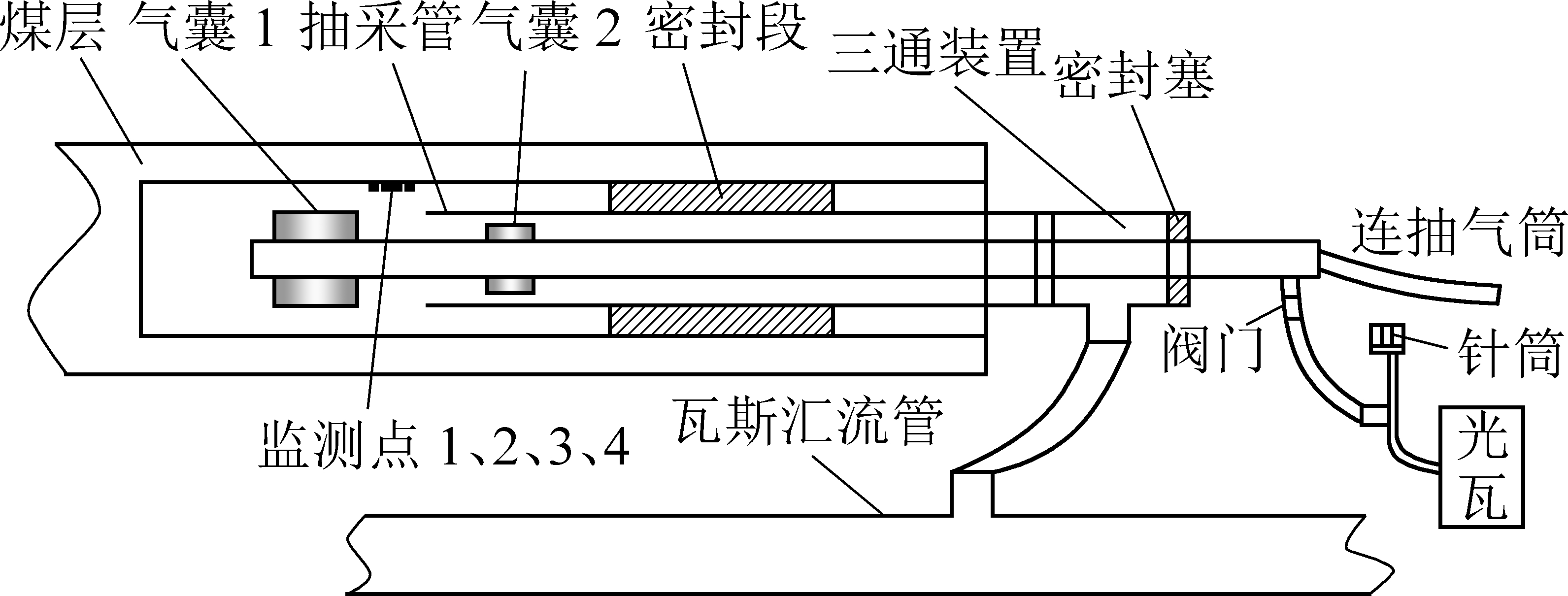 2)提出瓦斯抽采失效钻孔漏气位置检测及管底二次注浆提浓技术,并研发出由封孔气囊、双通道连接管、孔口三通等部件组成的相应装备。形成了孔内二次注浆的新工艺,实现了靶向精准注浆的理念。