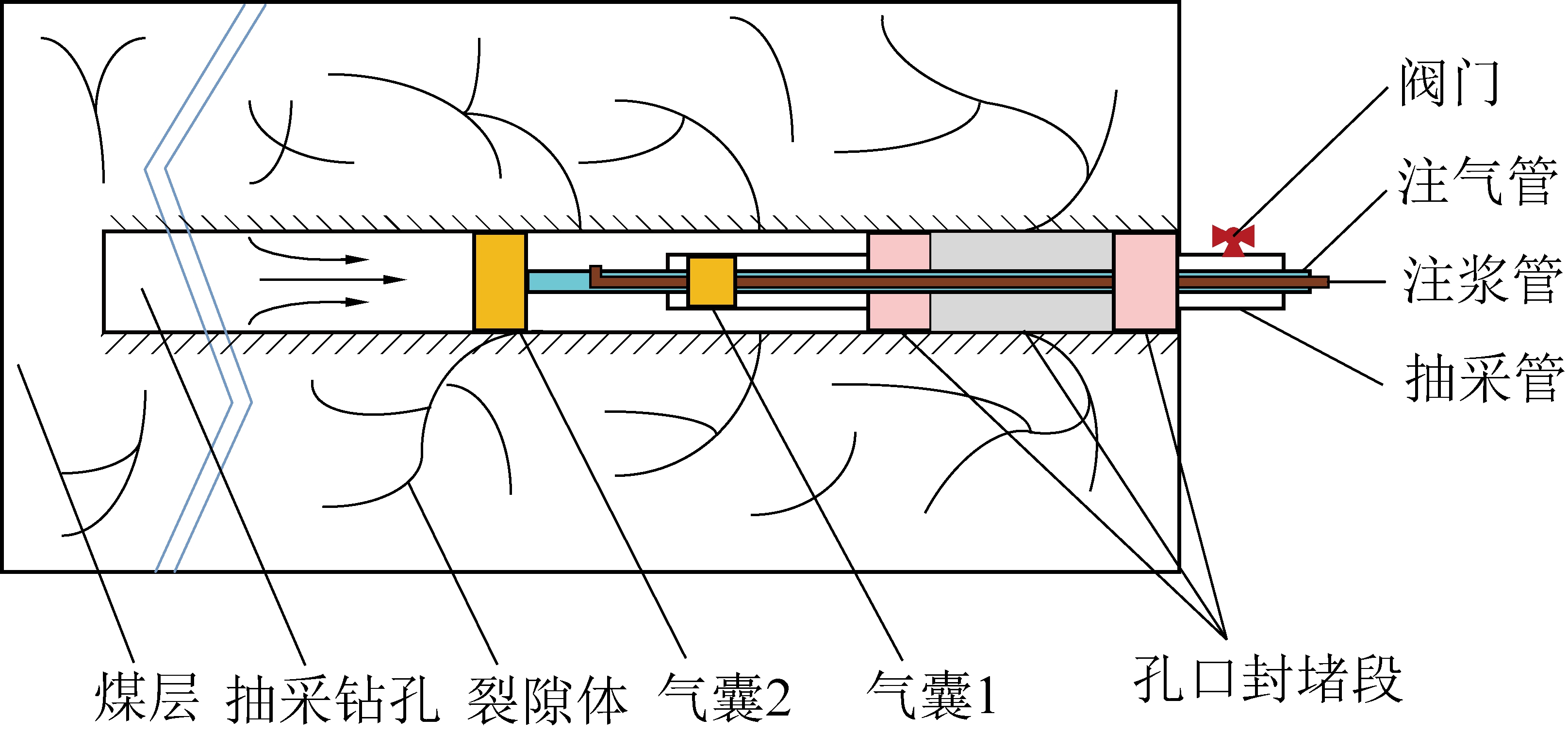将该装置的里气囊深入孔内合适位置(图3),使得探测的漏气区域位于2个气囊之间,通过向气囊内注气使其膨胀,外端气囊封堵住瓦斯抽采管端部,里端气囊封堵住钻孔,2个气囊以及之间的煤壁形成1个封堵区域,再向封堵区进行带压下注浆,浆液充满封堵区将孔内漏气通道填充后,进入钻孔周边发育的裂隙,实现孔外漏气通道的封堵与钻孔浓度的提升。