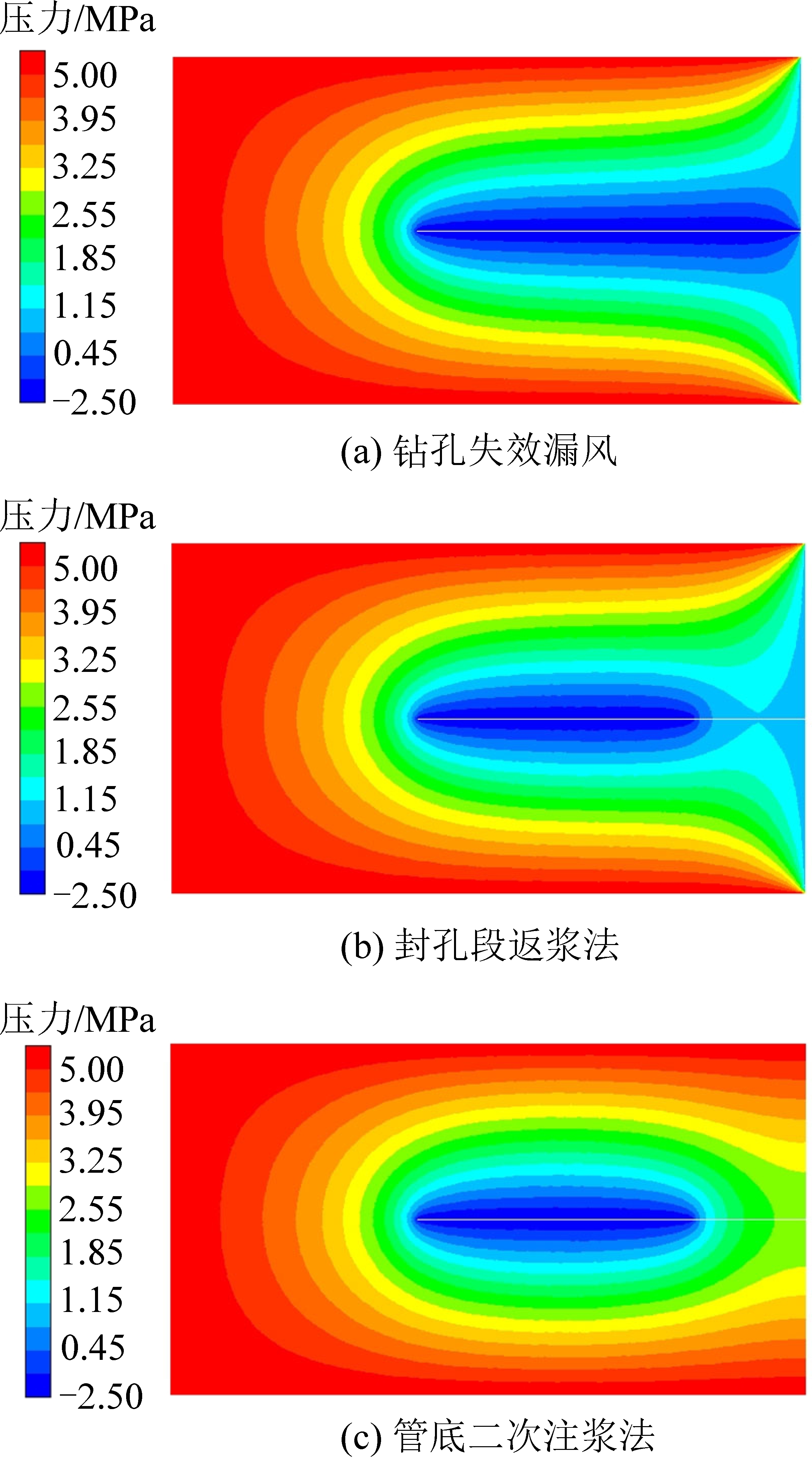 根据钻孔漏气机理可知,钻孔失效漏气时,由于裂隙通道的产生,巷道气体会通过裂隙通道或者钻孔封孔段进入钻孔。为研究管底二次注浆的堵漏效果,分别设置钻孔失效漏气、一次封孔段返浆、管底二次注浆3种工况进行模拟计算分析,3种不同工况下,煤层钻孔抽采瓦斯压力云图如图7所示。