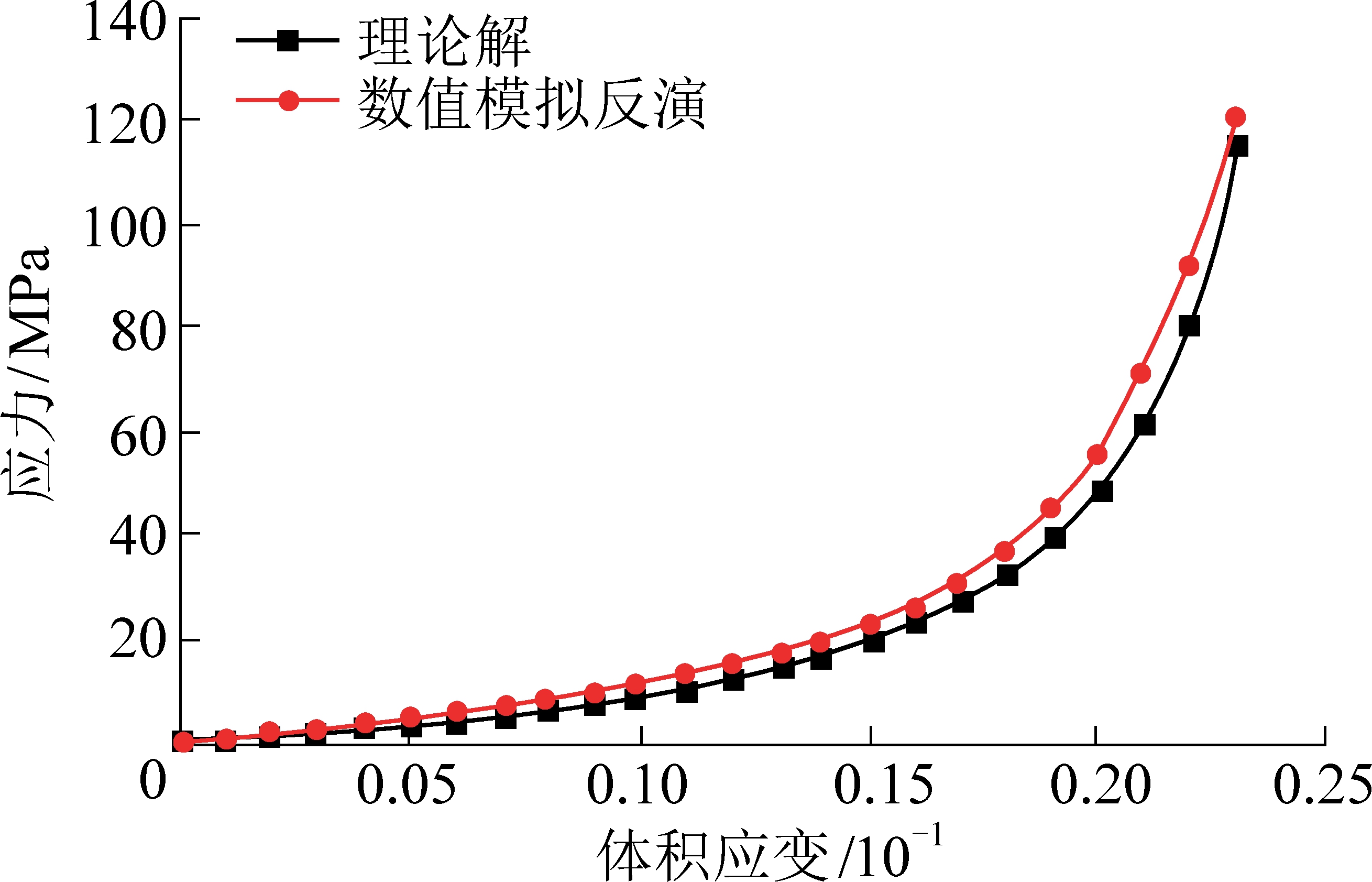 为得到合理的破碎岩体参数且使其应力-应变关系能够与式(9)匹配,首先建立长、宽为1 m、高为2 m的简单块体模型,赋予双屈服模型,底部固支,顶部自由移动,其他4个面约束横向位移。在其顶部表面施加竖向速率模拟加载过程,通过迭代反演获得拟合度比较合适的岩体力学参数。经反复模拟计算,得到破碎岩体岩体力学参数见表3,反演匹配结果如图2所示。