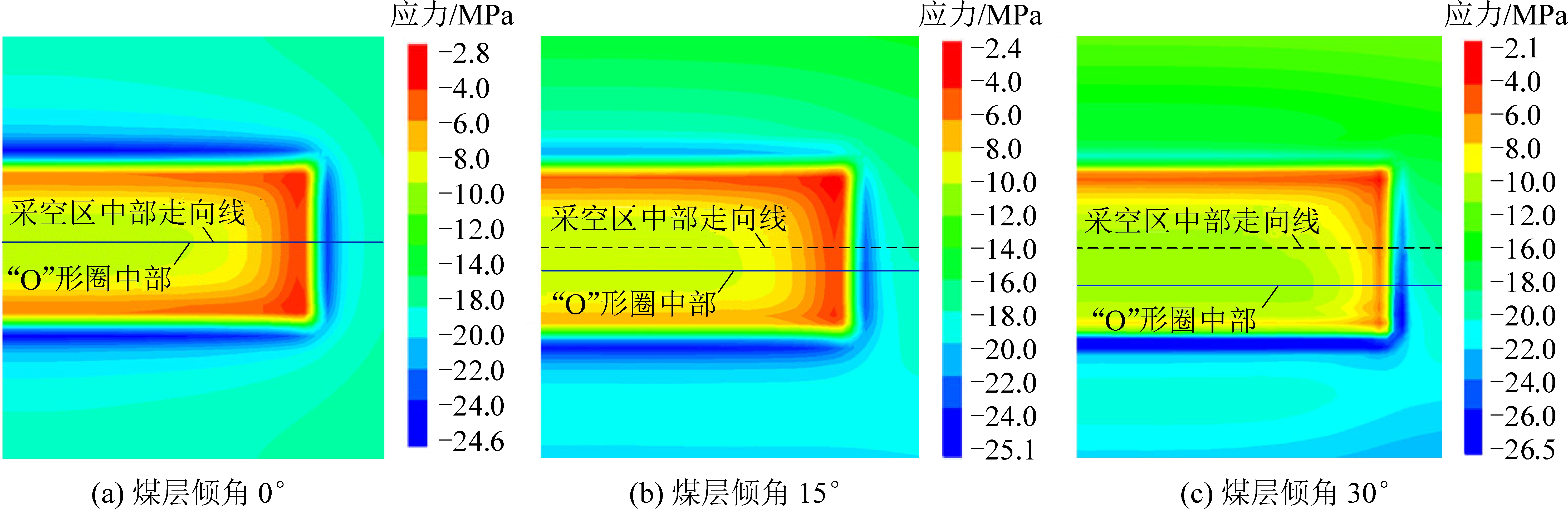 同时,图5可反映出采空区由于垮落带压实造成的应力恢复现象。采空区应力恢复在走向上有着显著差异,距离工作面较远的采空区中部应力恢复程度较高,距离采空区边界越近即越靠近工作面应力恢复程度越低。随着煤层倾角增大,在采场倾向上、中部,采空区内部应力恢复程度均逐渐减小,而在采场倾向下部,采空区内部应力恢复程度则逐渐增大。