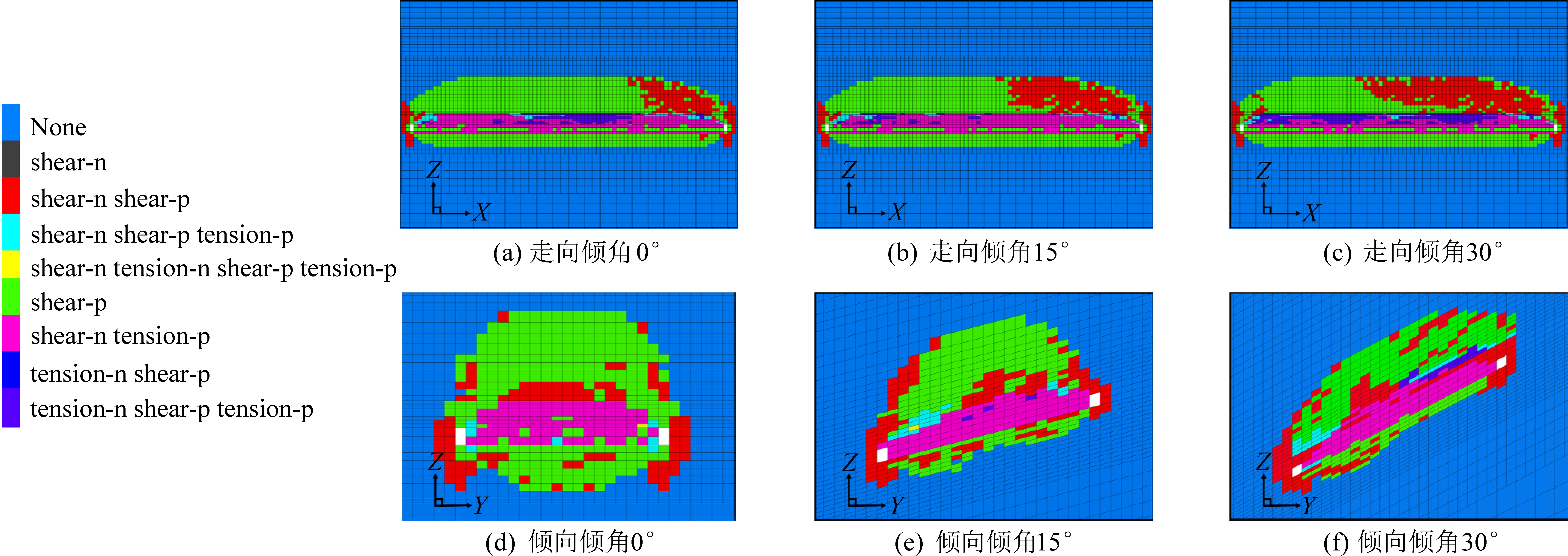 图7为倾角0°、15°、30°的工作面推进400 m时,沿走向和倾向顶底板塑性破坏区分布。