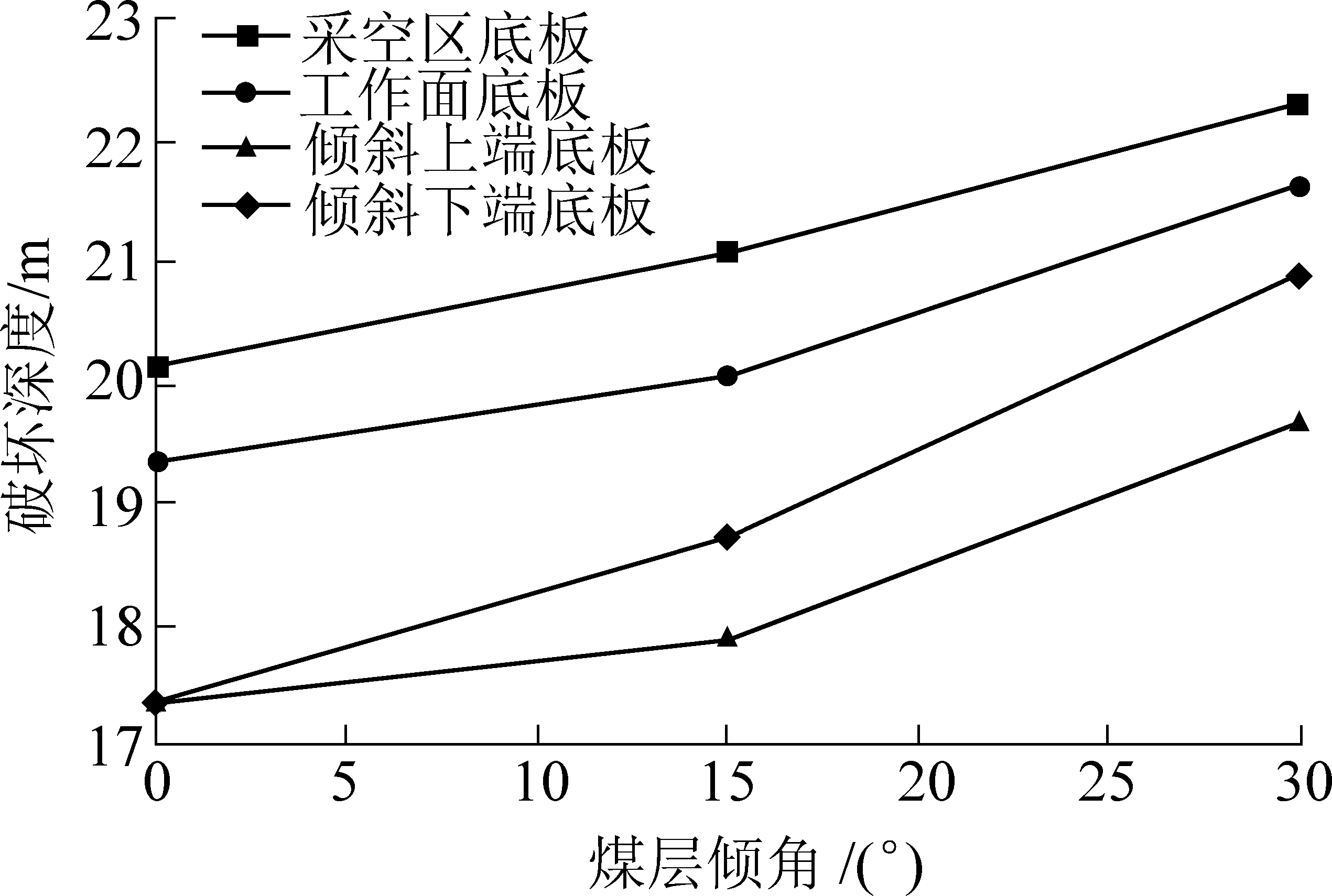 如图8所示,沿倾向上下端、工作面及采空区底板煤体内塑性破坏深度均呈现随煤层倾角增大而增大趋势,这是由于底板煤体在30°左右时,所受到的剪切应力最大,更容易发生滑移破坏。沿倾向,在采空区两侧的侧向支承压力的作用下,形成1个沿倾向长度大于工作面长度塑性破坏区;由图8反映出倾向上端破坏深度始终小于下端破坏深度,但倾向上端和下端破坏深度均随着煤层倾角增大而增大。