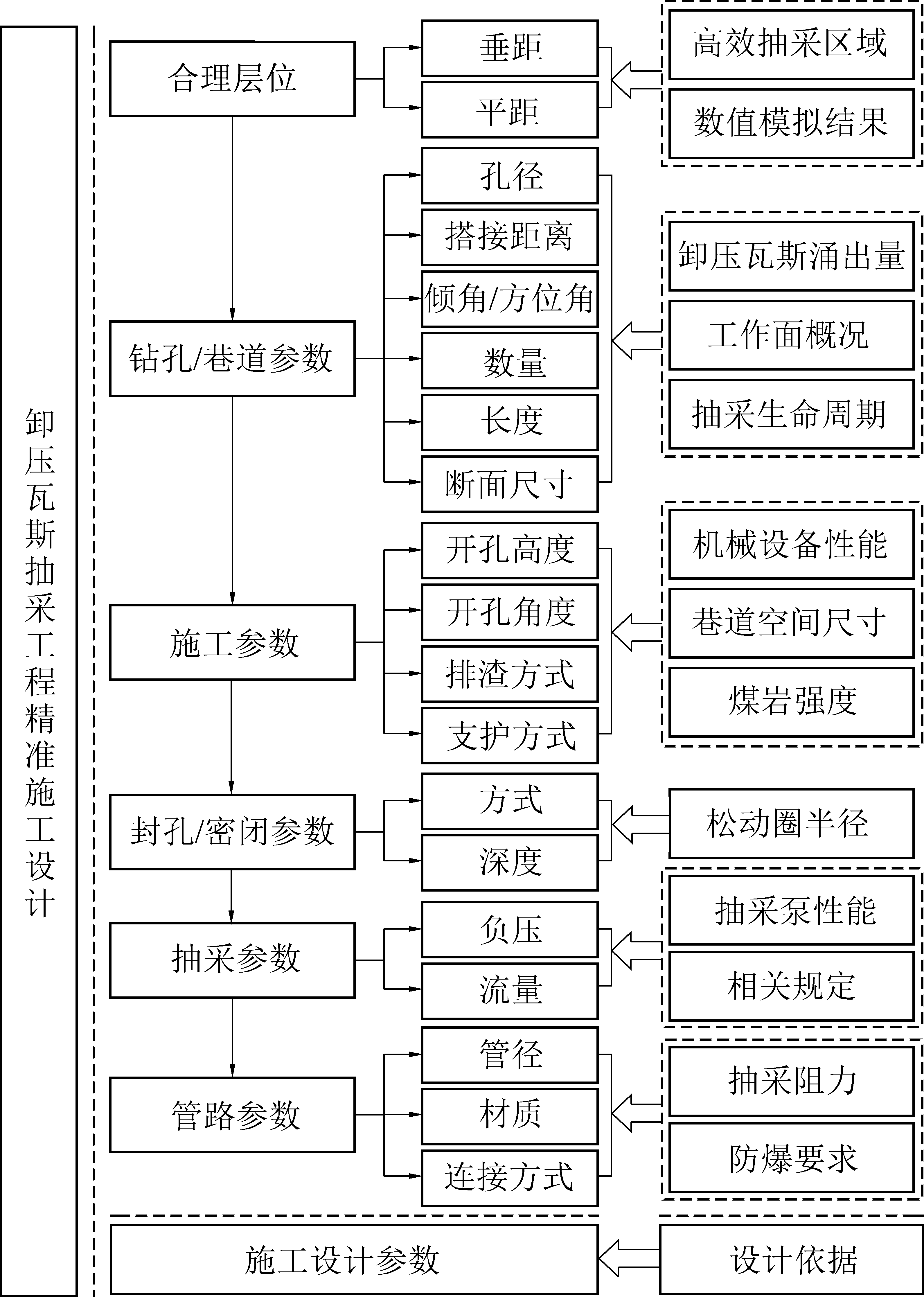 卸压瓦斯抽采方式主要包括钻孔抽采及巷道抽采,设计施工包括合理层位、巷道/钻孔参数、施工参数、密闭/封孔参数、抽采参数、管路参数等内容,如图5所示。