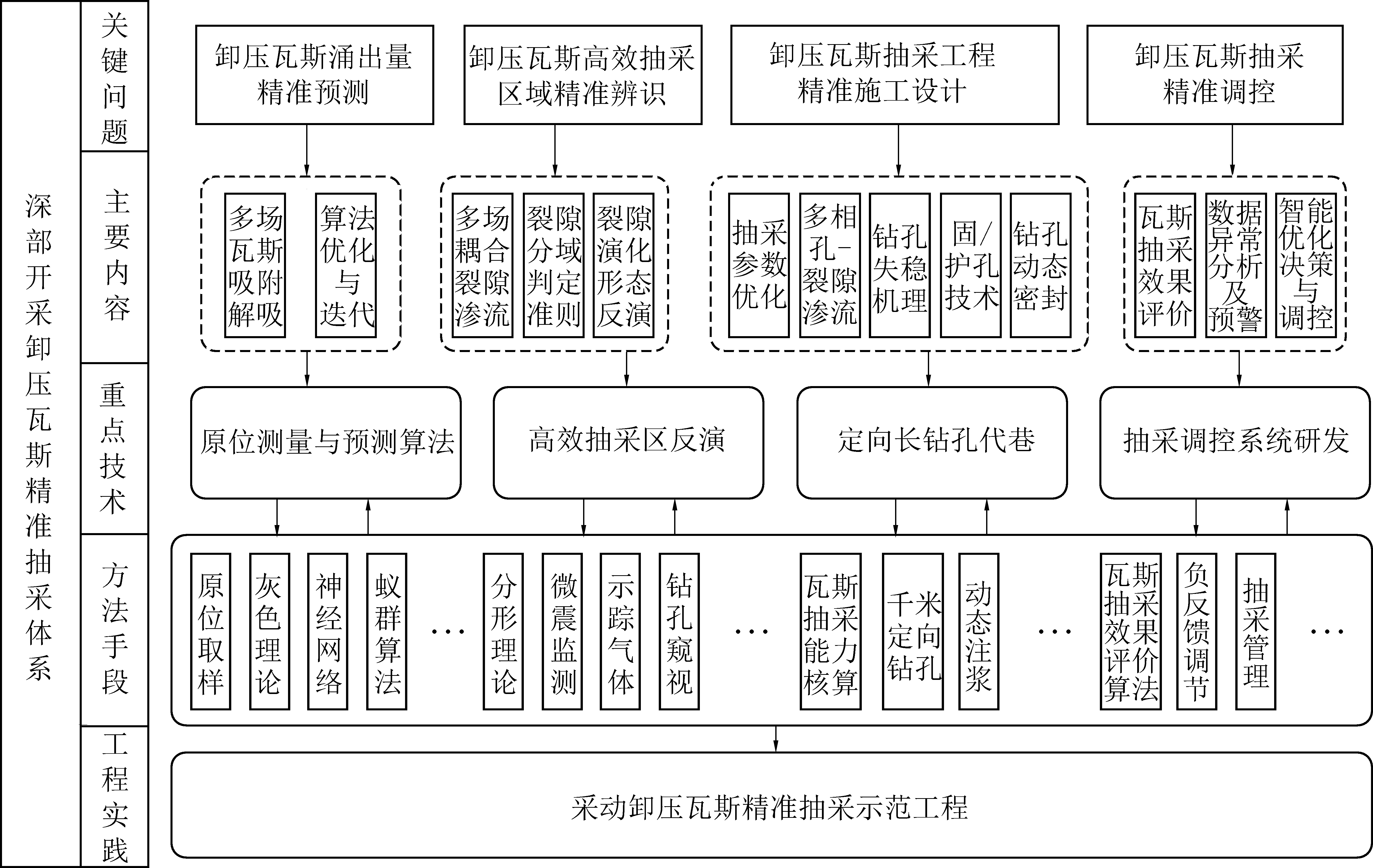 瓦斯涌出量精准预测为卸压瓦斯抽采工程提供设计基础,高效抽采区域精准辨识明确抽采目标靶心,抽采工程精准设计施工提高卸压瓦斯抽采的精确度和准确度,精准调控对整个卸压瓦斯抽采效果进行精细管控,四者相互衔接。主要内容作为整个框架基石,是对4个关键问题的深入延展,重点技术、手段与方法是实现精准抽采体系的依托和途径,工程实践体现整个体系应用效果验证。