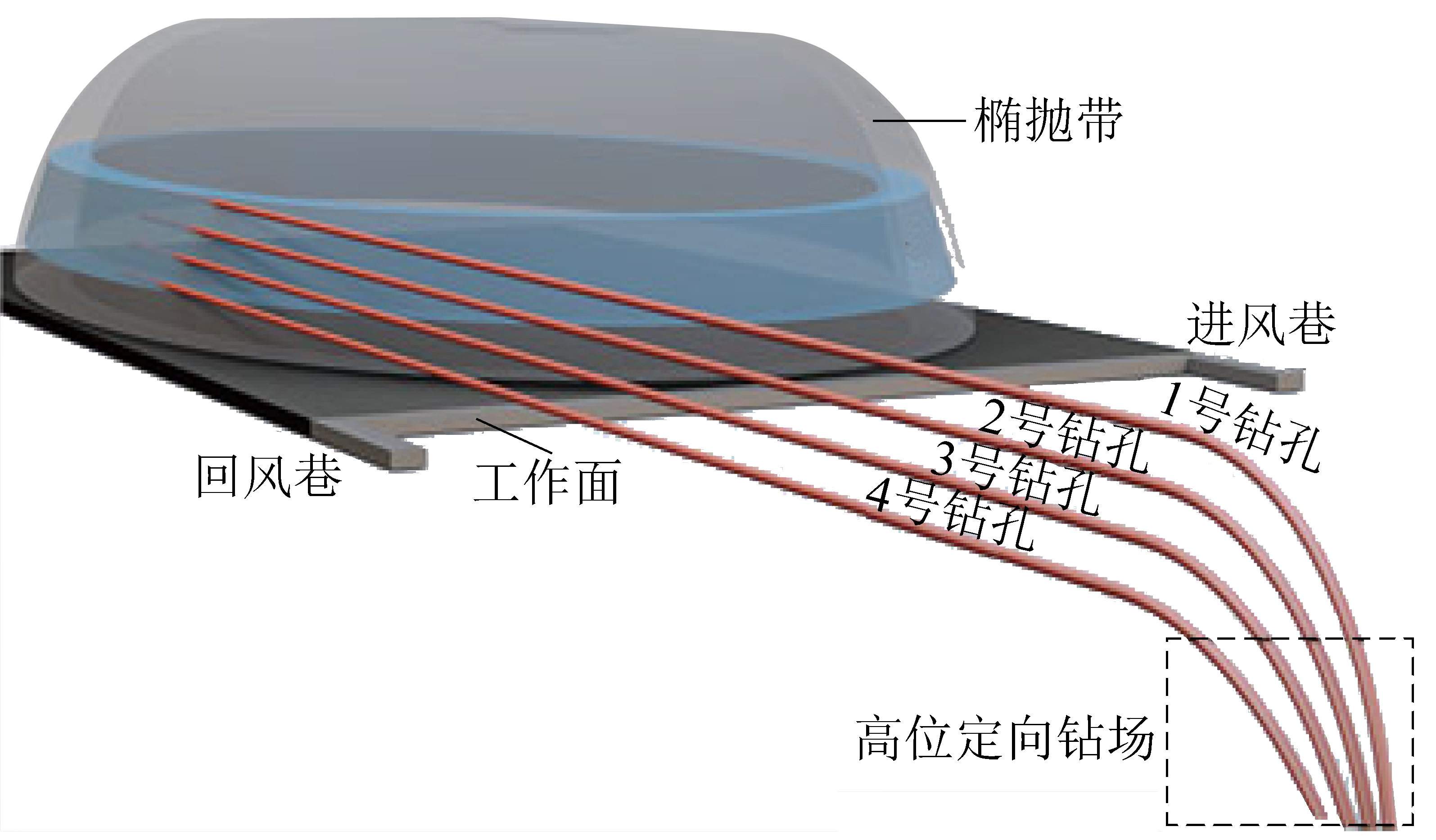 工作面回采过后上覆岩层受采动影响垮落会形成裂隙带,研究表明采动裂隙带是卸压瓦斯主要的运移和存储区域,是一个不断动态变化的分域体,从三维构型看可视为椭圆抛物带(工程简化为梯台带),全面掌握采动裂隙场的形态演化规律和精准判定裂隙带区域的物理边界,为抽采系统的准确高效布置提供了最根本的理论指导。