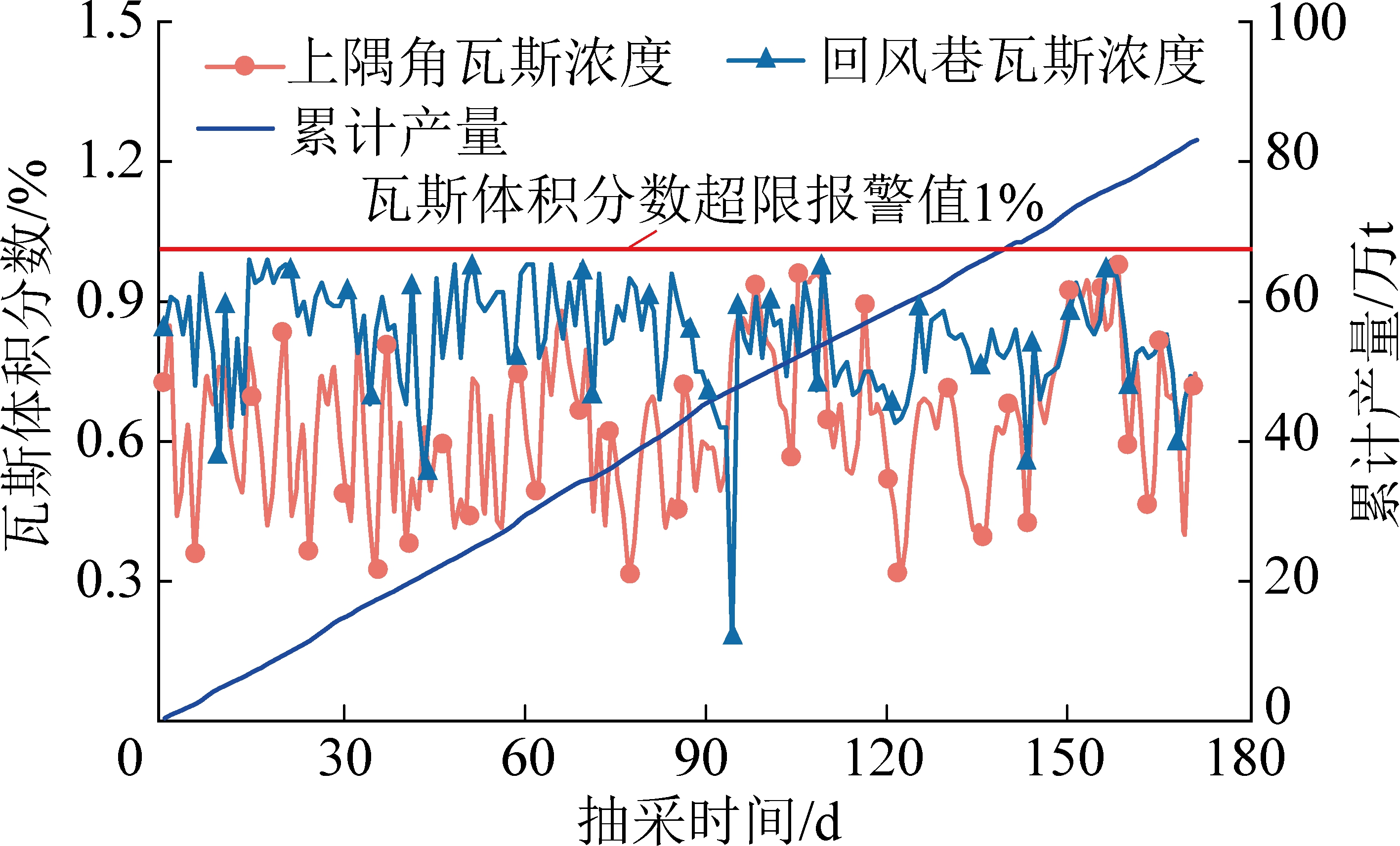 通过应用走向长钻孔与高抽巷协同抽采技术、采取了有效的瓦斯控制技术措施,保证工作面、上隅角、回风巷最大瓦斯体积分数均控制在1%以内(图13),保障了高瓦斯大采高煤层工作面安全高效生产,为高瓦斯大采高煤层开采卸压瓦斯安全智能精准抽采奠定了基础。