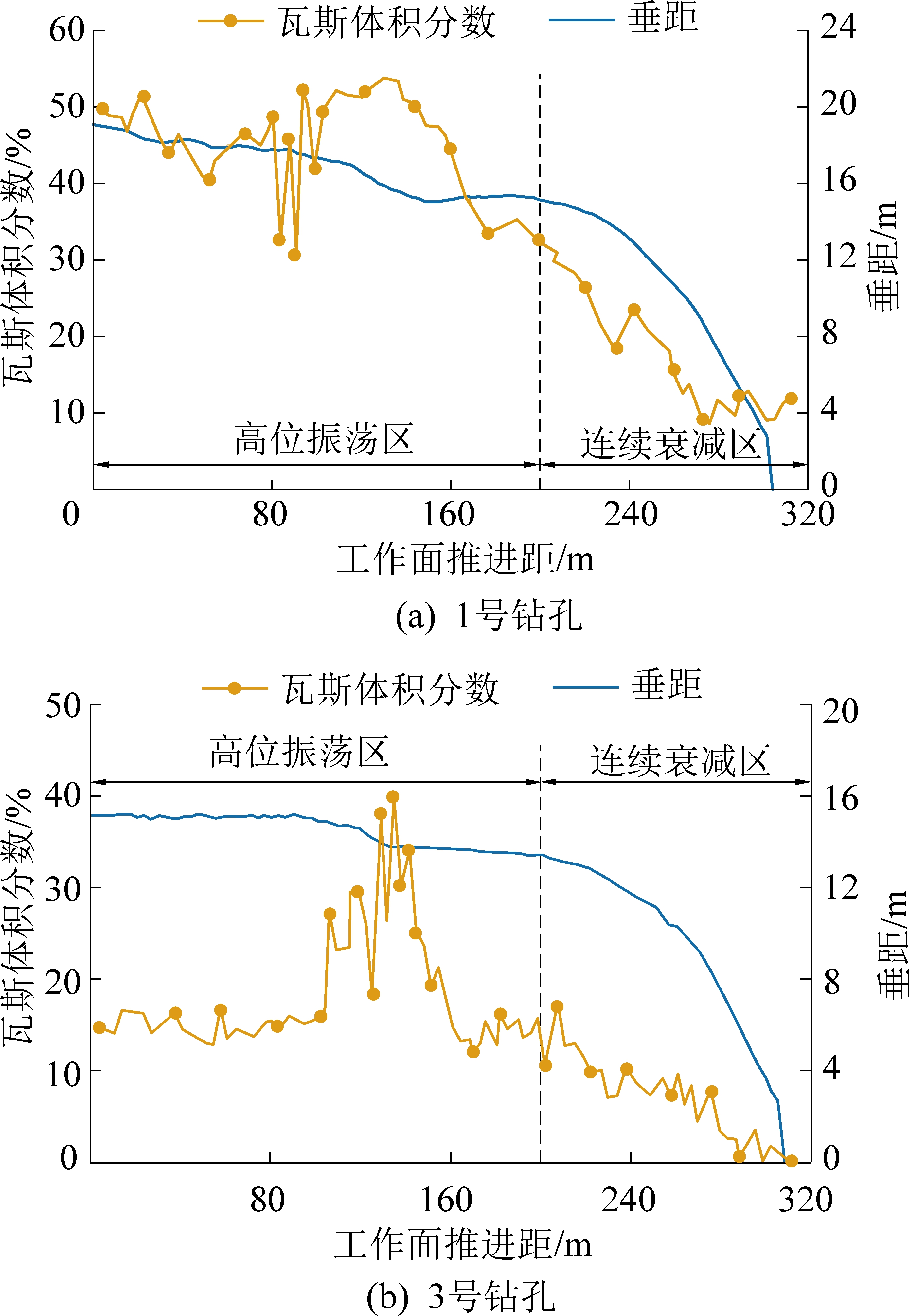 6)利用矿井瓦斯信息监控平台持续对1号钻场各定向钻孔抽采浓度进行持续监测计量,得到随着工作面推进各钻孔瓦斯抽采浓度与钻孔垂距呈正相关关系(图11),即垂直层距越大其抽采瓦斯浓度越高。单孔抽采生命周期分为前200 m高位振荡和后100 m连续衰减区2个时期。终孔垂距前200 m范围内,1号钻孔垂距平均为17.92 m,瓦斯抽采体积分数为30.56%~54.00%;3号钻孔垂距平均为15.04 m,瓦斯抽采体积分数为11.55%~40.06%。