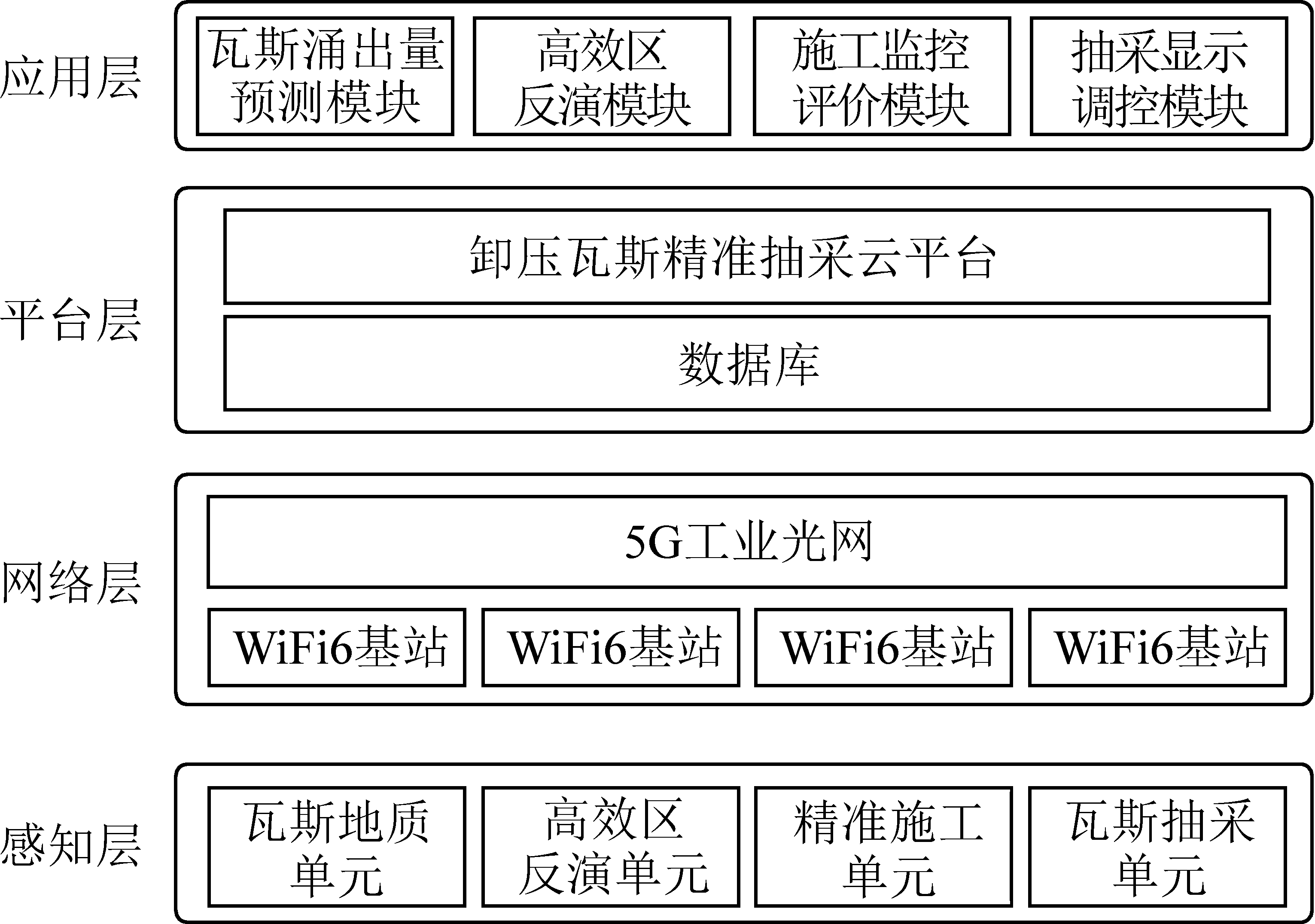 卸压瓦斯精准抽采云平台分为感知层、网络层、平台层、应用层4个层级,利用高清红外监控、高精度测控仪表、无线传输终端、智能控制设备等,搭建矿井低延时、大数据流、动态反馈的数据感知系统。充分发挥基于WiFi6和5G技术的组合优势,将瓦斯地质数据、采空区探测数据、钻孔巷道施工数据、瓦斯抽采数据等多源、多空间、多维度海量数据上传至云端数据库,进行深度挖掘。